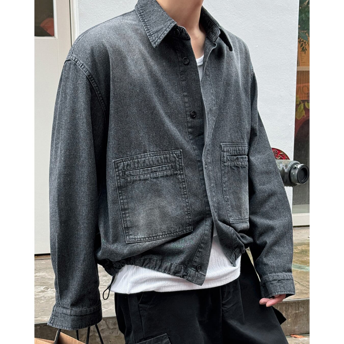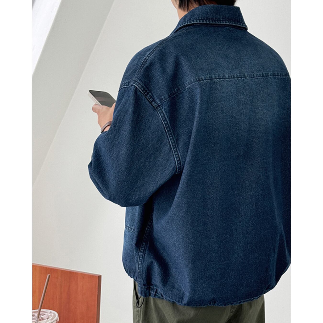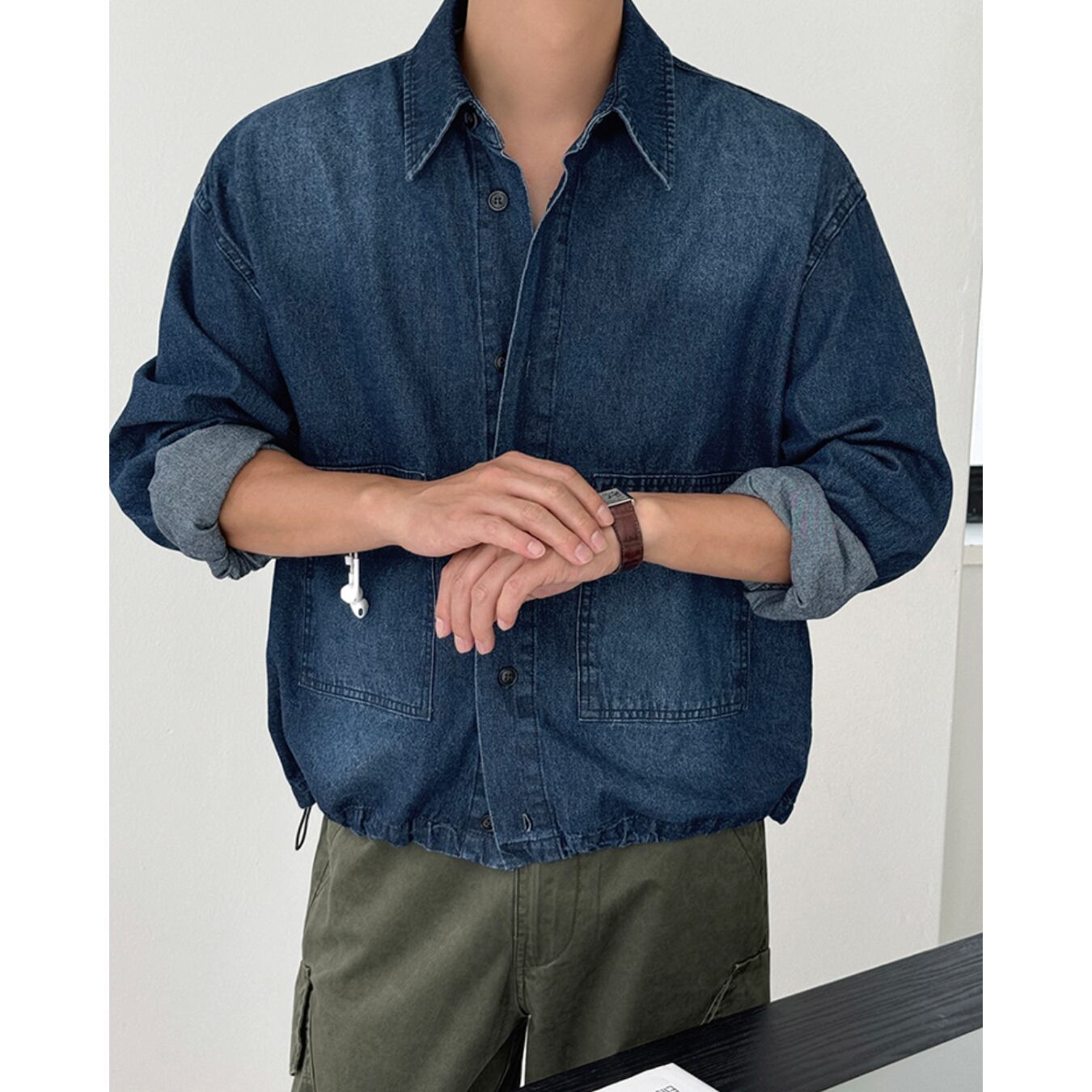 腰回りにかからない短丈シルエットが、全体のバランスを引き締め、トレンド感のある着こなしを演出します。