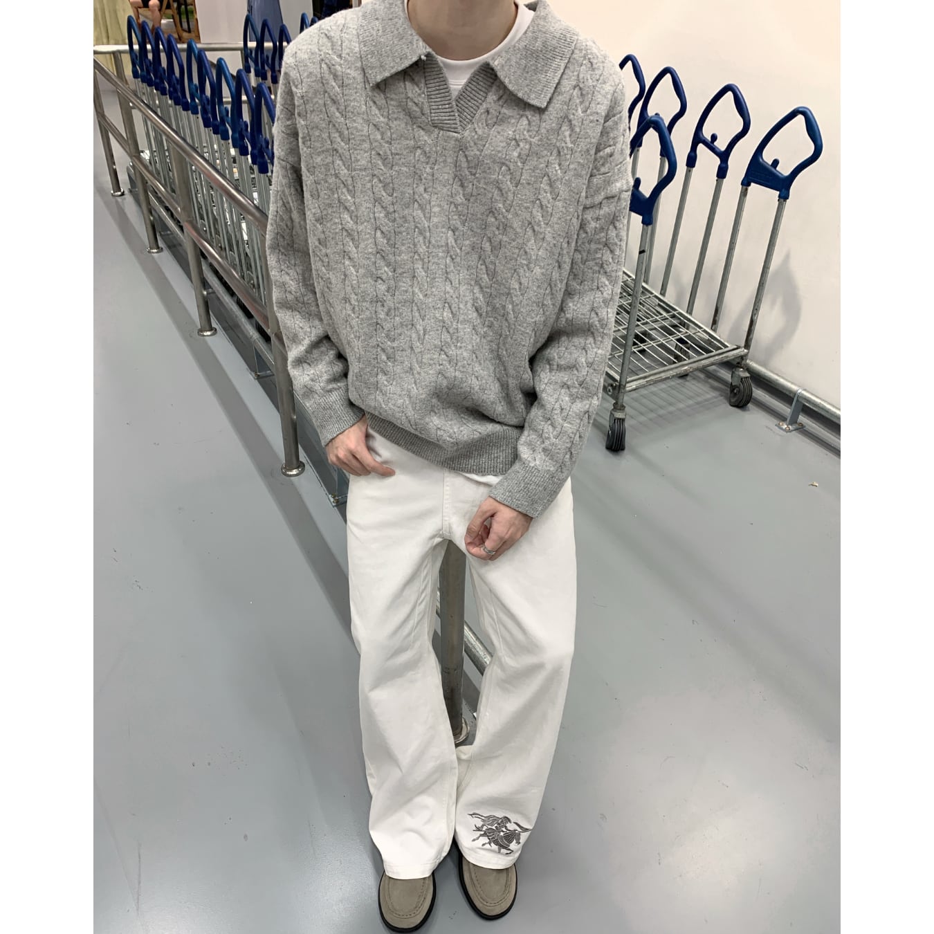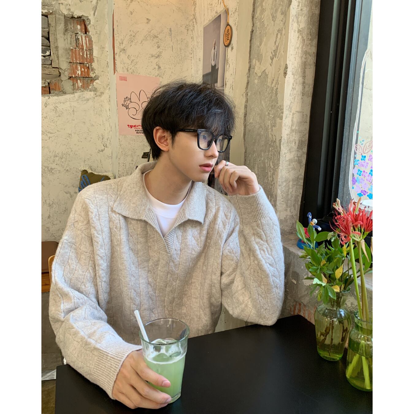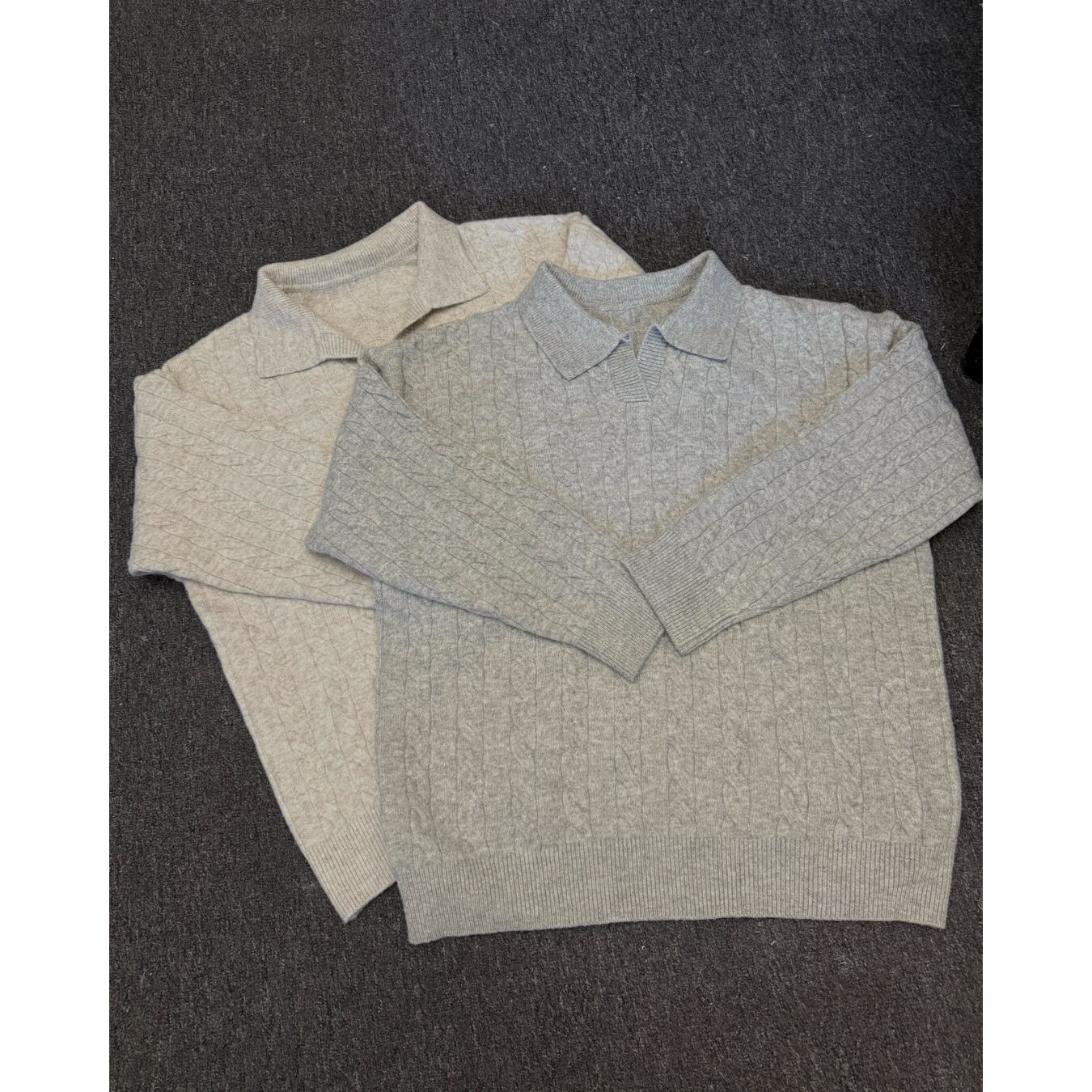 立体的なケーブル編みと控えめなポロカラーが特徴。