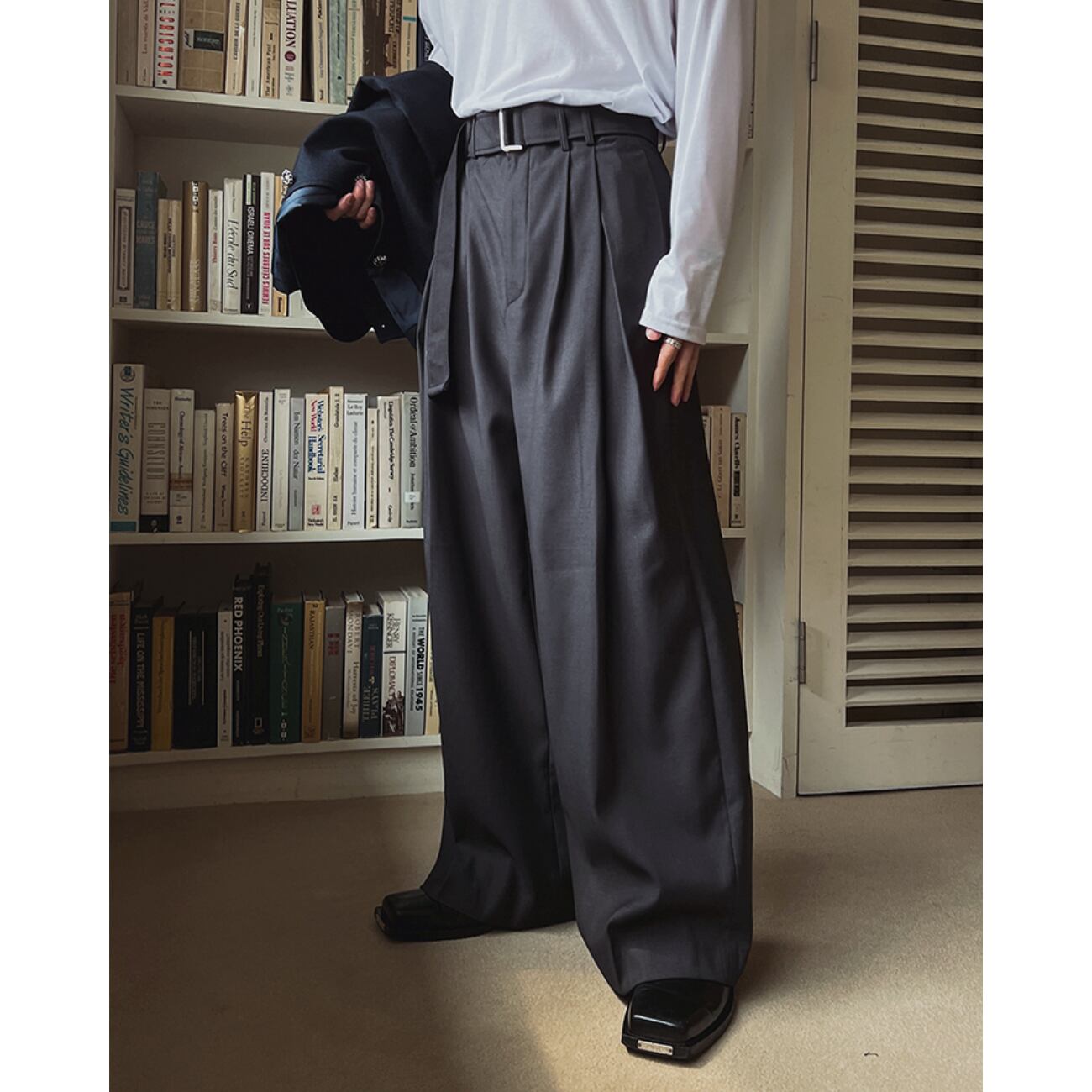 深めのタックが立体的なドレープを生み、歩くだけで上品な揺れを演出します。