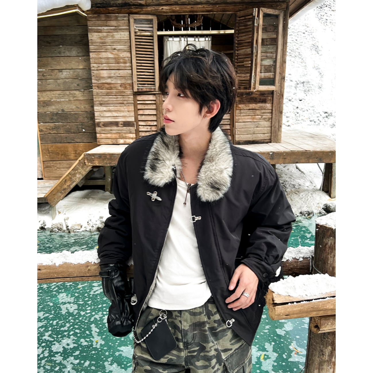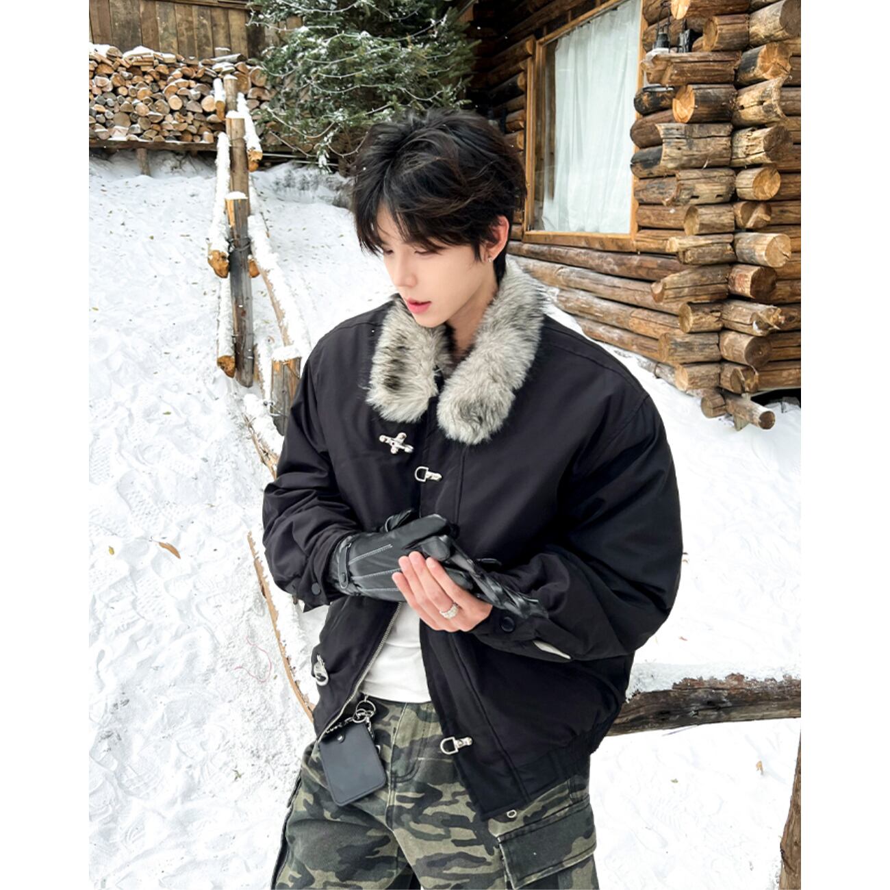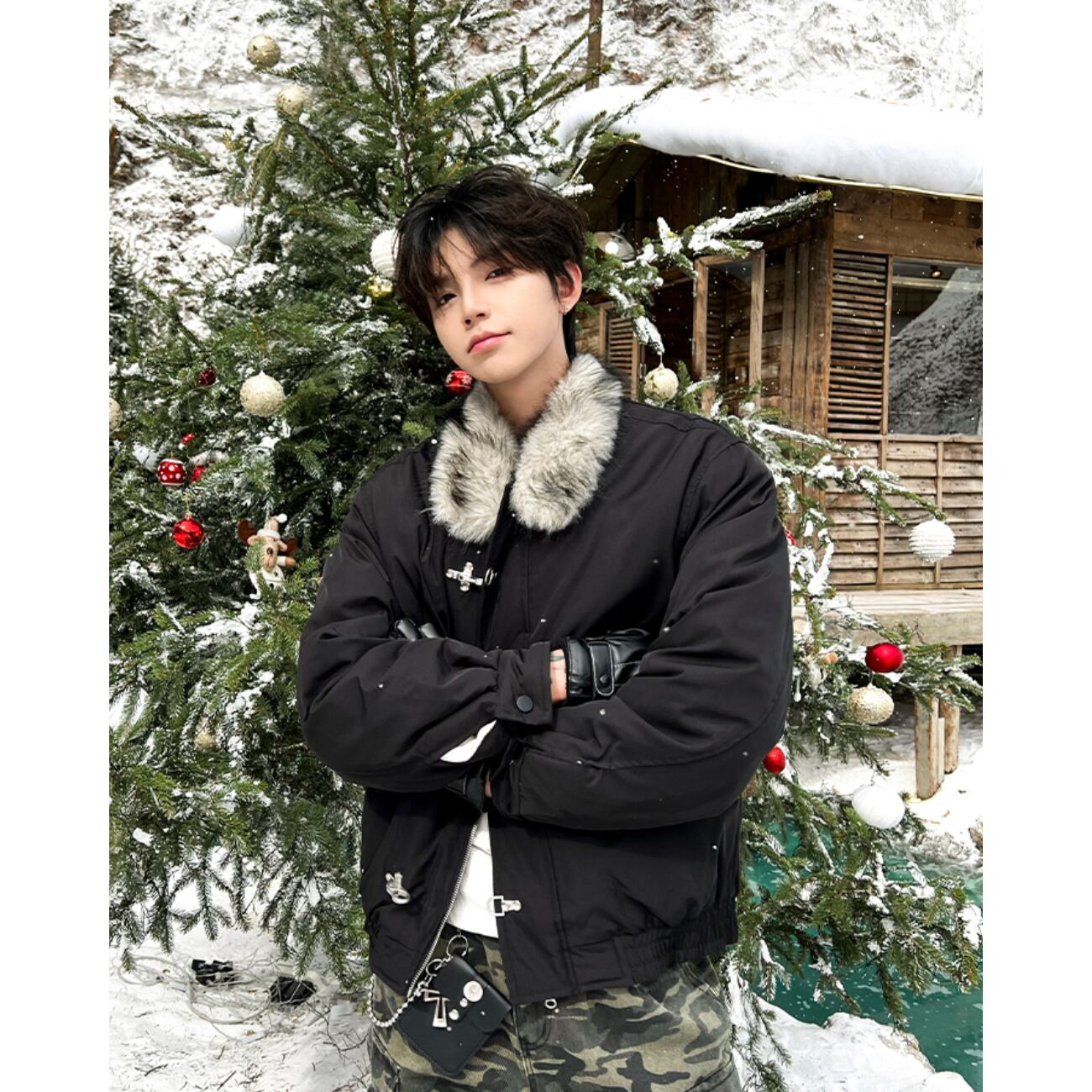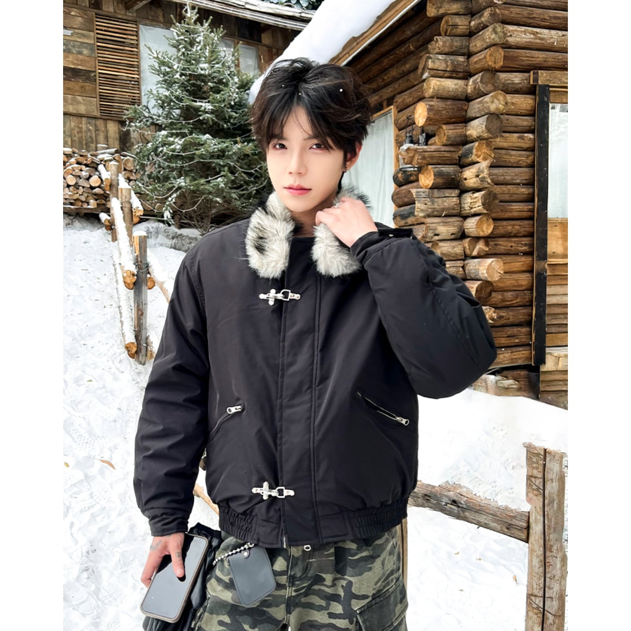 襟元のファーが首まわりをふんわり包み、ジッパー+メタルバックルの二重仕様がデザイン性と実用性を両立。