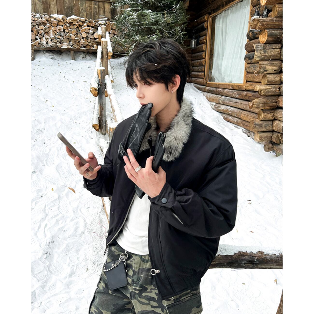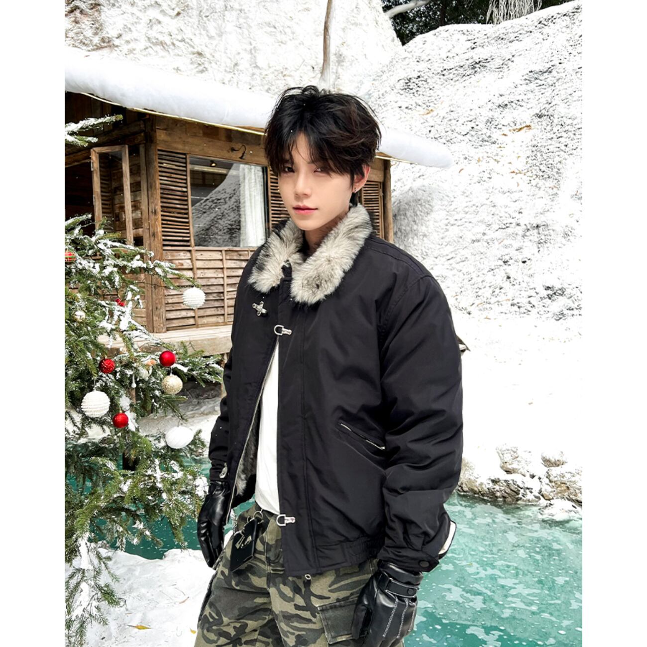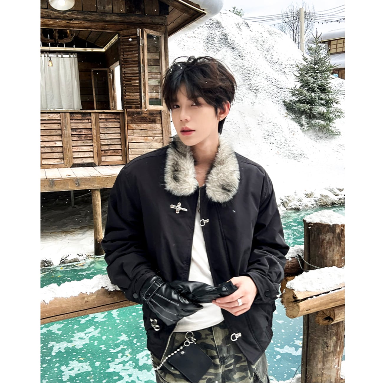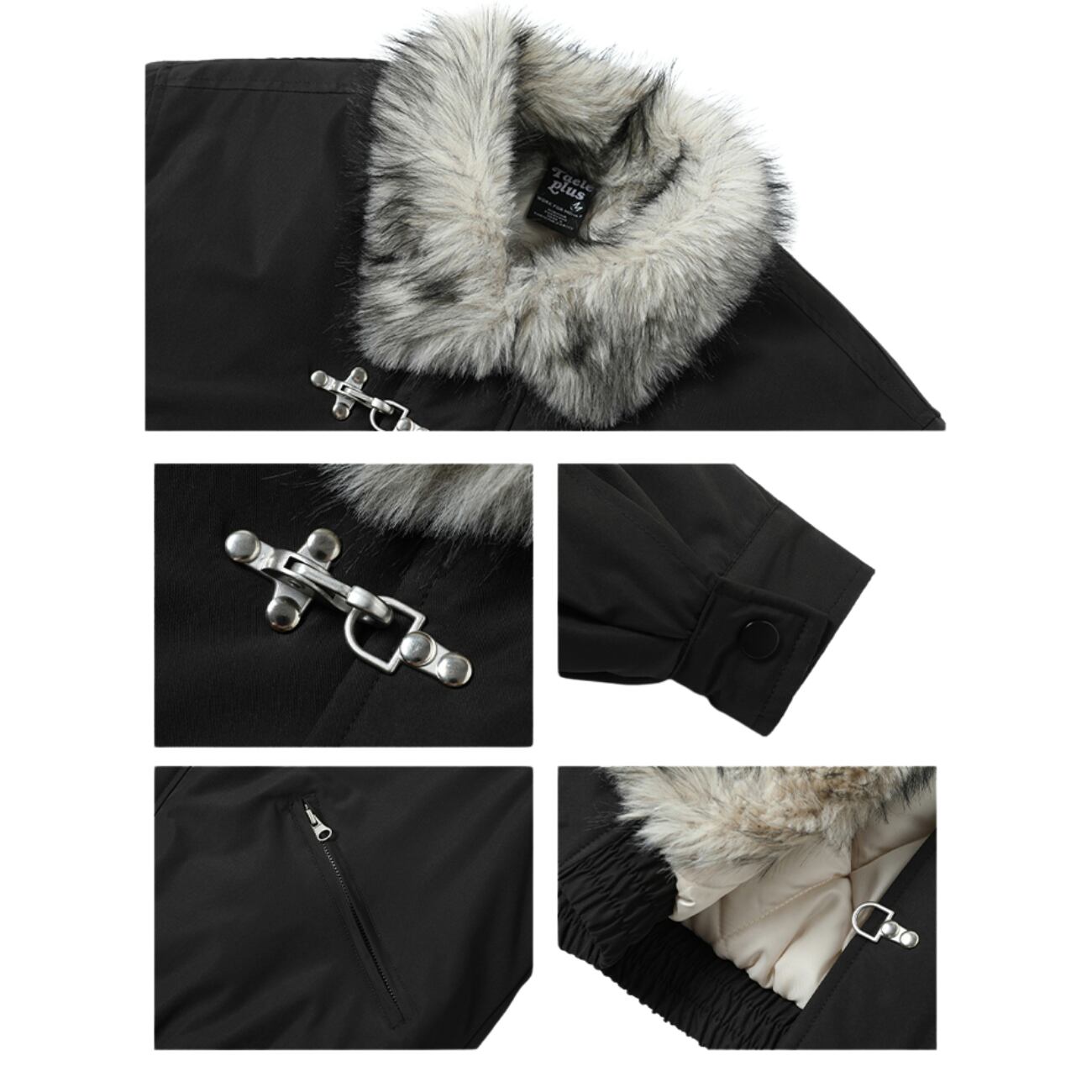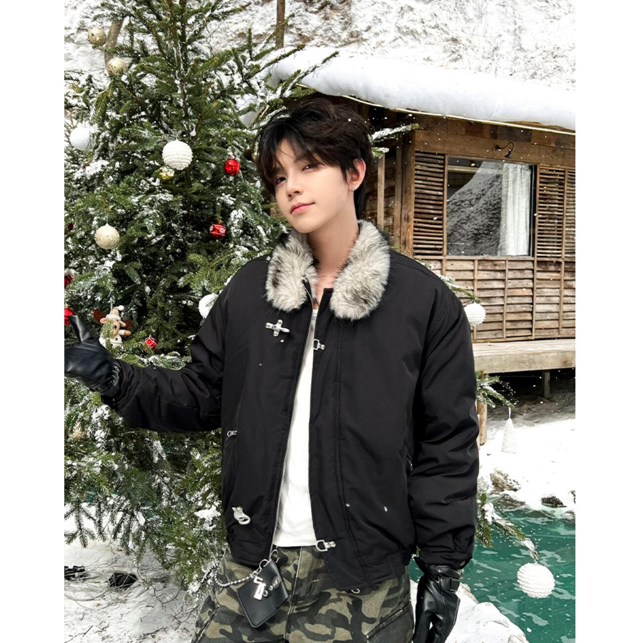 襟元のファーが首まわりをふんわり包み、ジッパー+メタルバックルの二重仕様がデザイン性と実用性を両立。