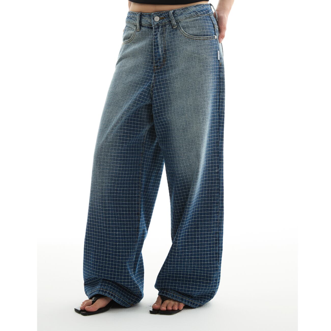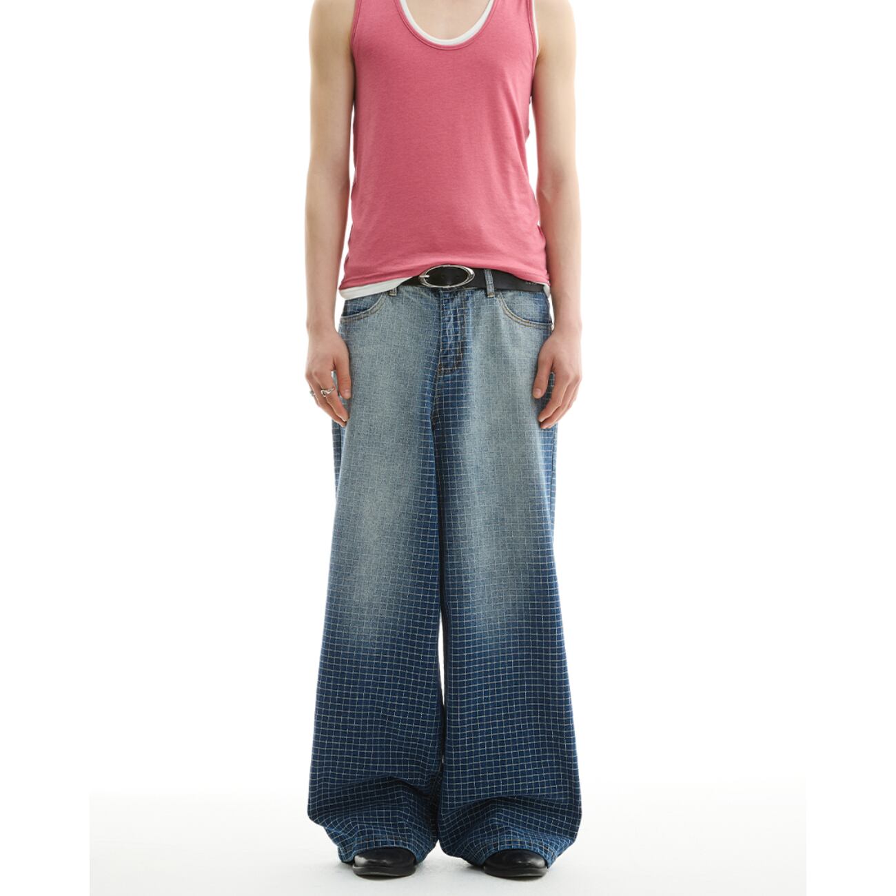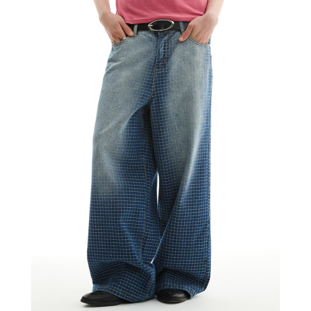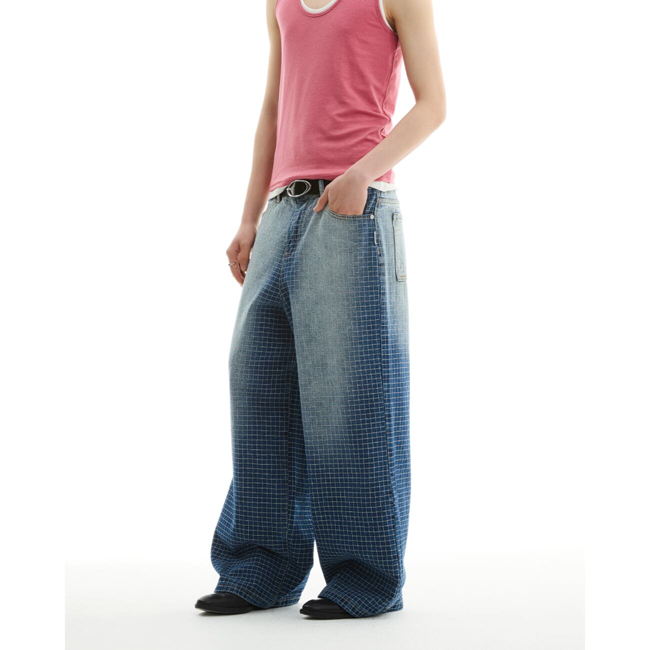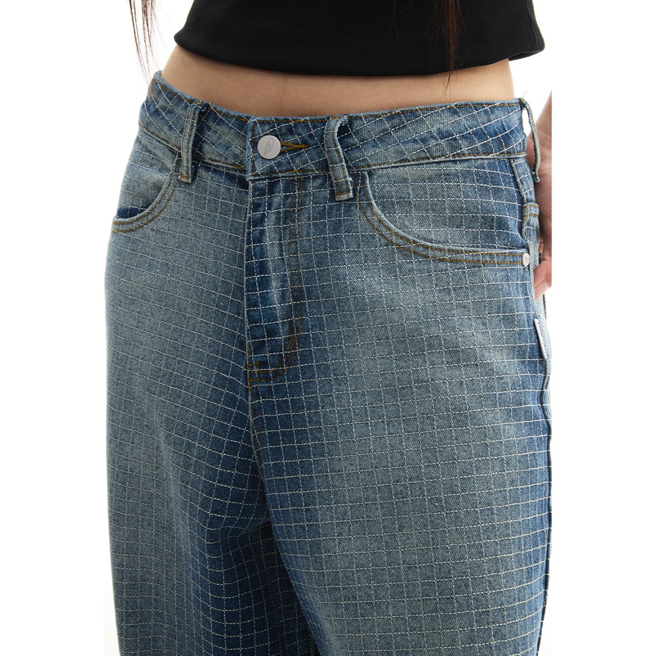 大胆なワイドシルエットに、グリッド状のパターン加工を施した存在感あるデニムパンツ。