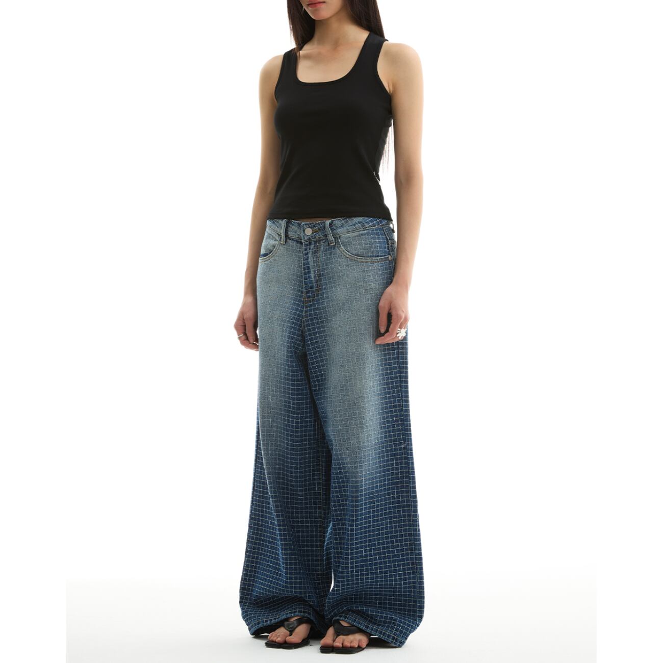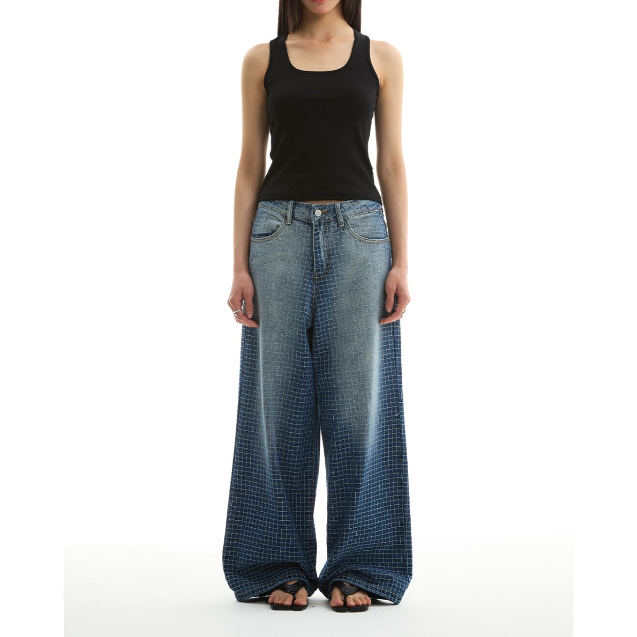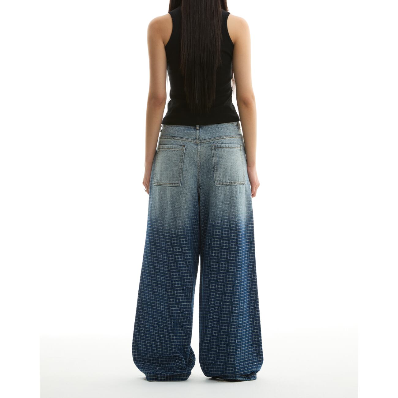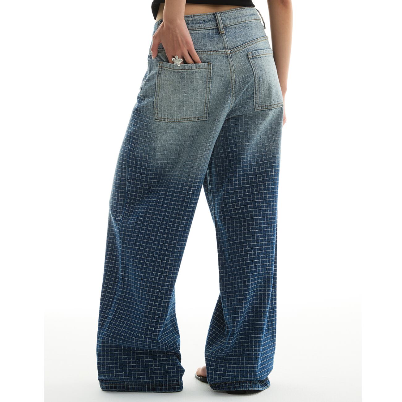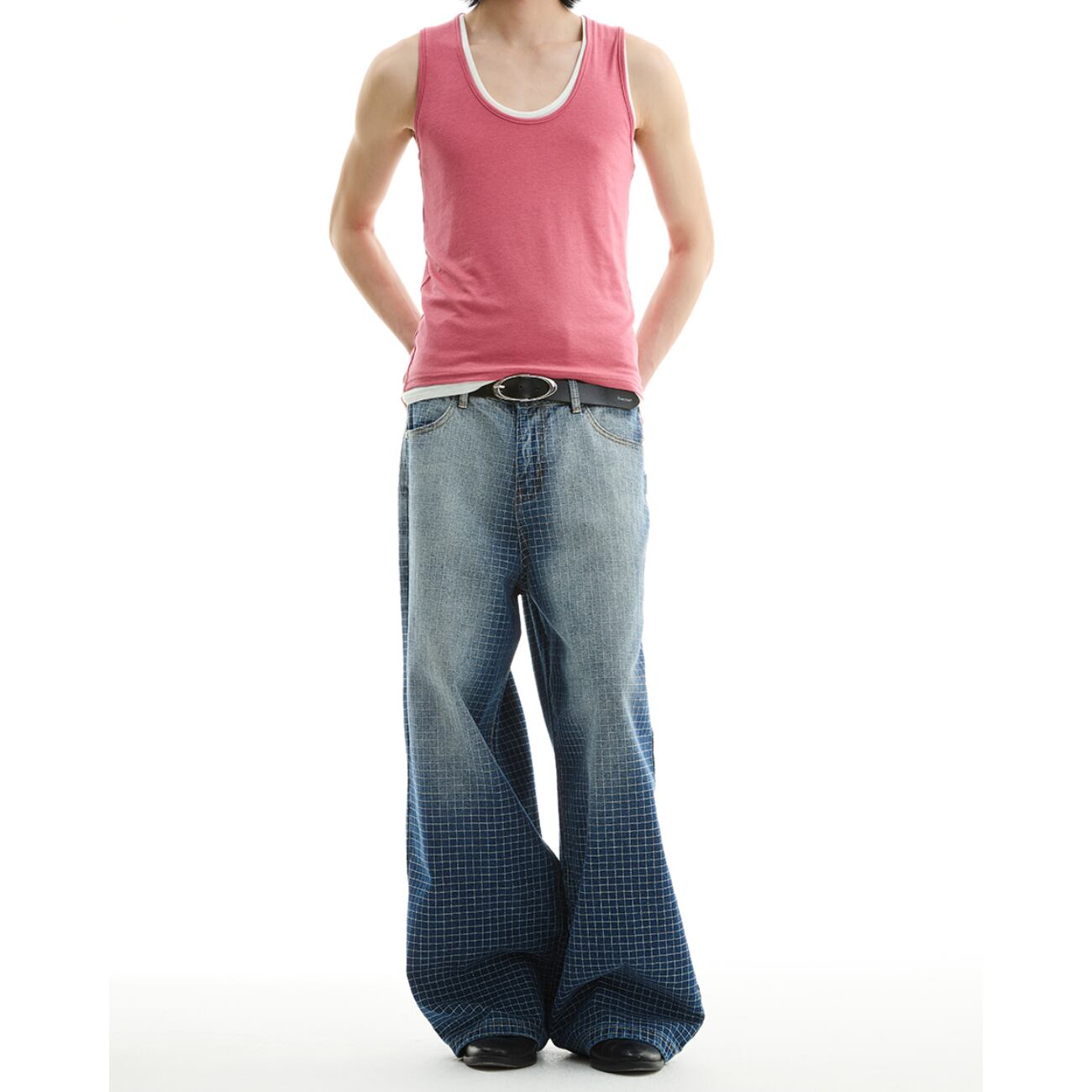大胆なワイドシルエットに、グリッド状のパターン加工を施した存在感あるデニムパンツ。