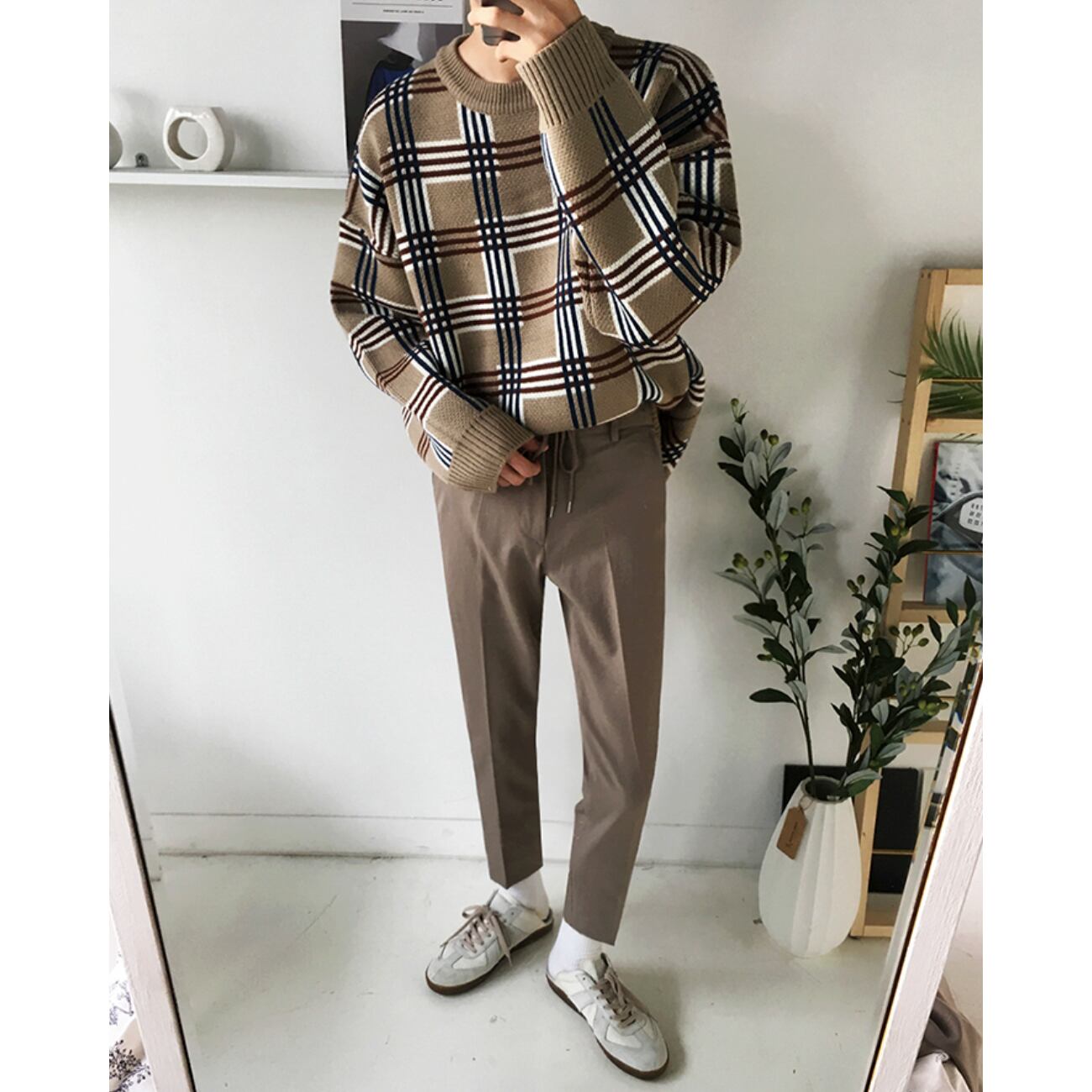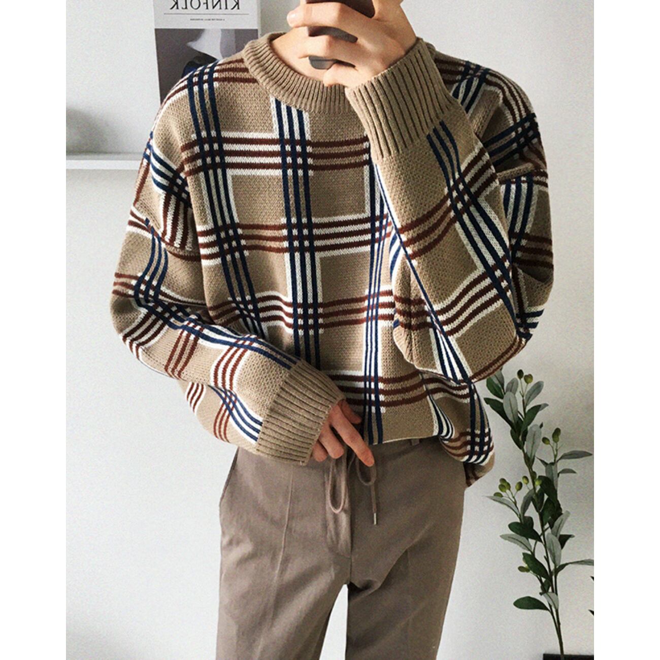 上品なカーキトーンに、大柄チェックを大胆に落とし込んだパターンニット。