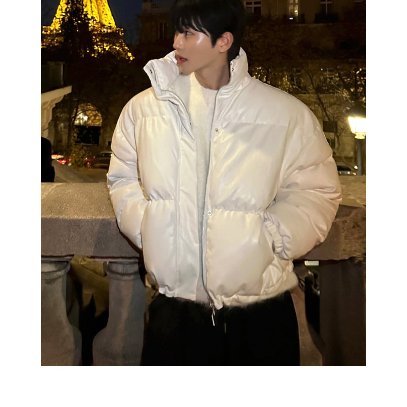 程よい光沢感のあるフェイクレザー素材を使用した、ショート丈のパデッドジャケット。