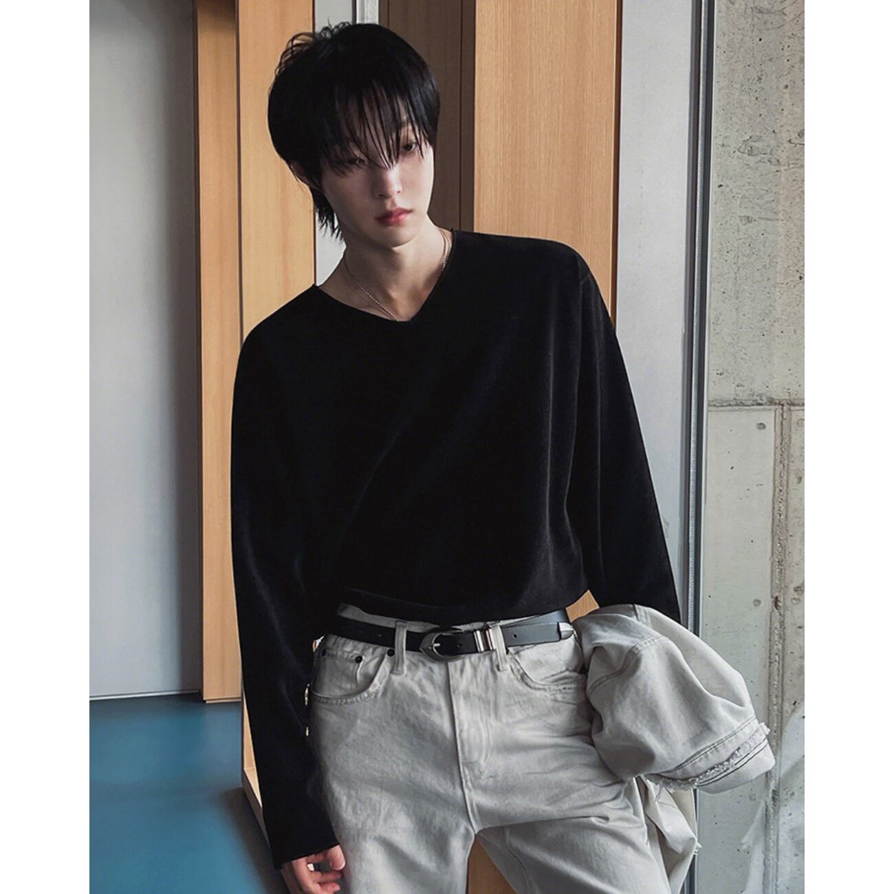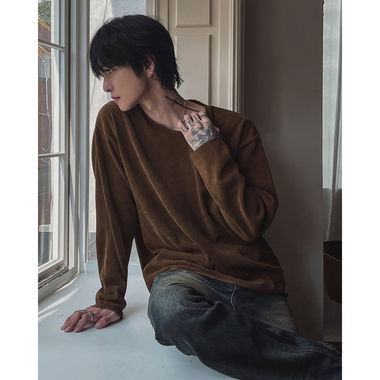 1枚で着てもサマになり、ジャケットやアウターのインナーとしても使いやすいバランスです。