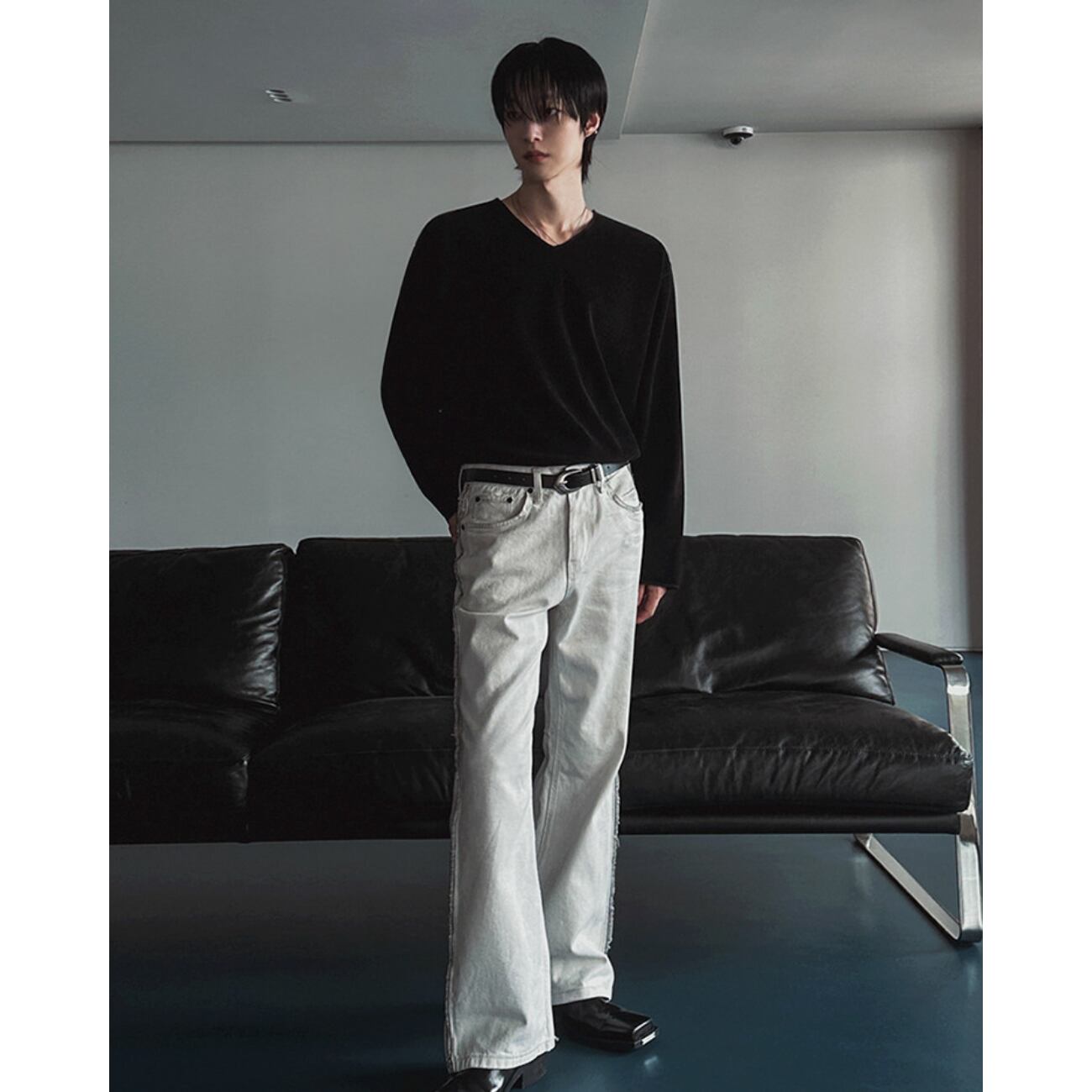 光の当たり方で表情が変わる素材感がスタイリングに奥行きをプラスします。