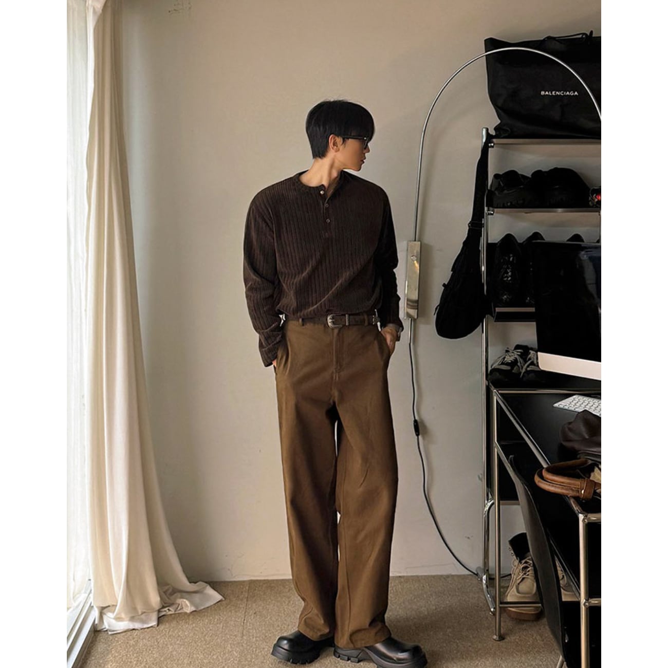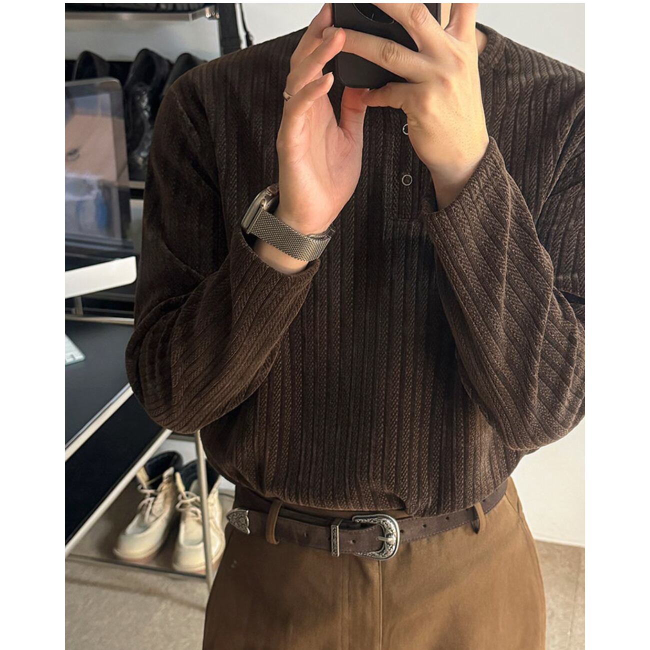 首元のボタンデザインが程よい抜け感を演出し、