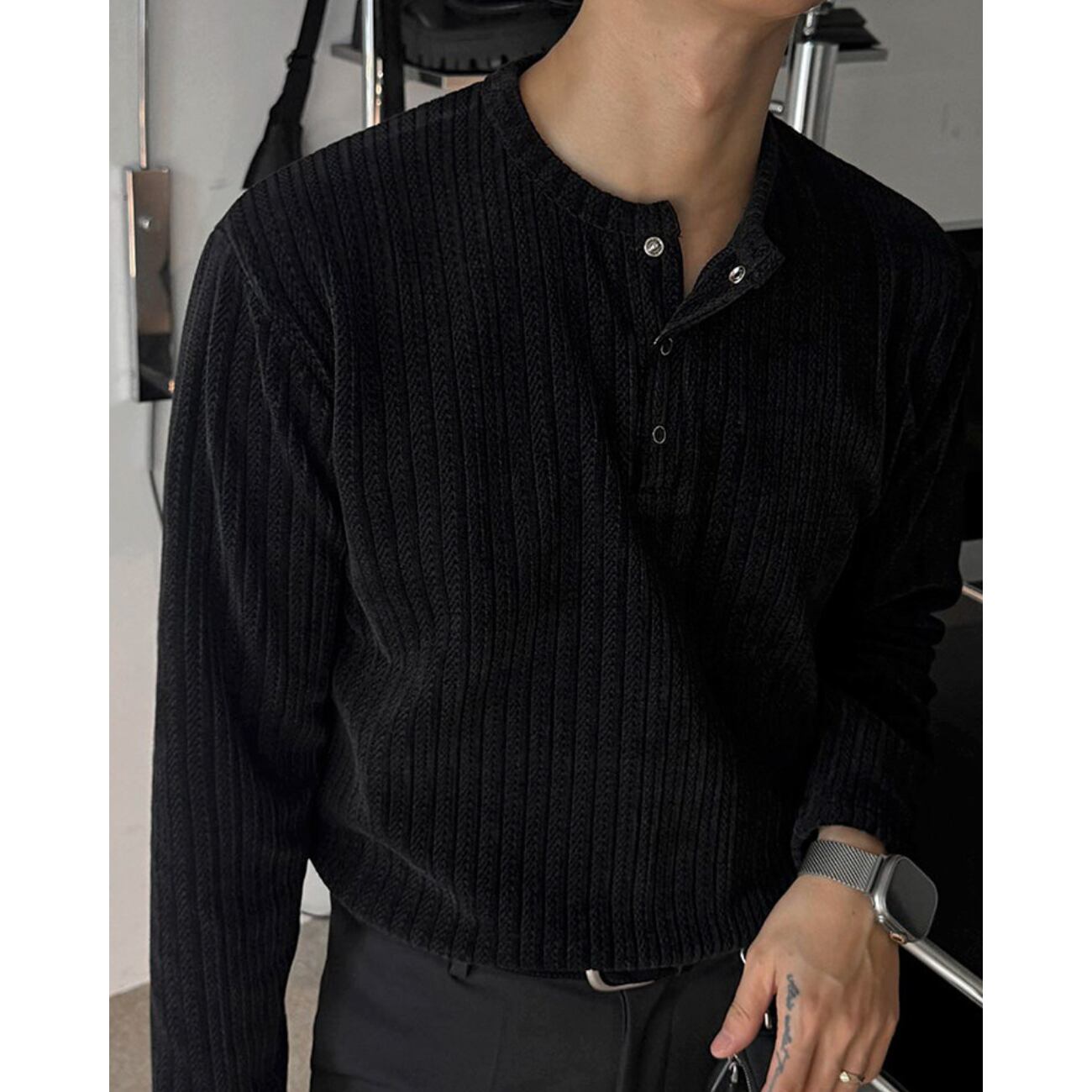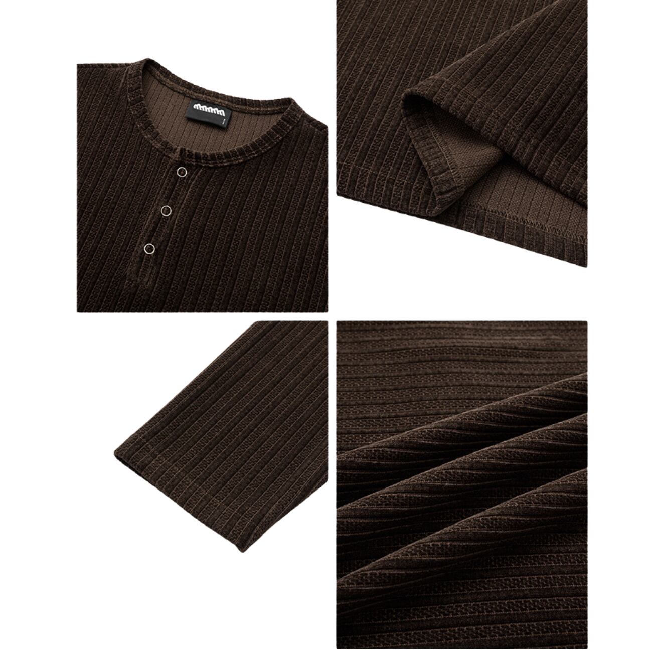 立体感のある縦リブ生地が印象的なヘンリーネックロングスリーブT。