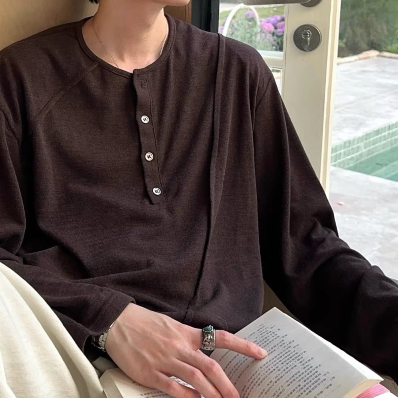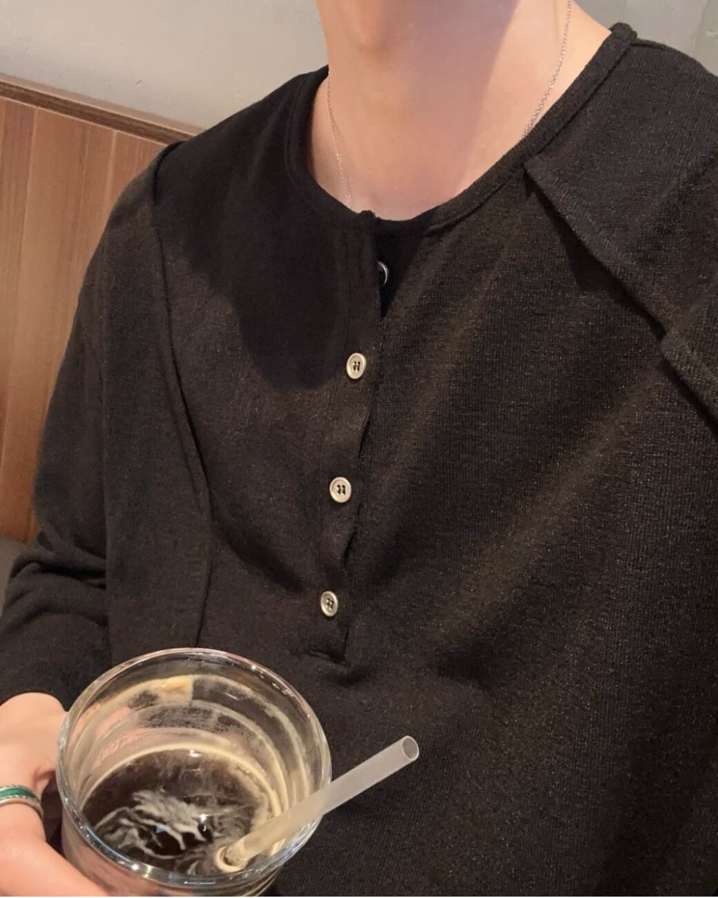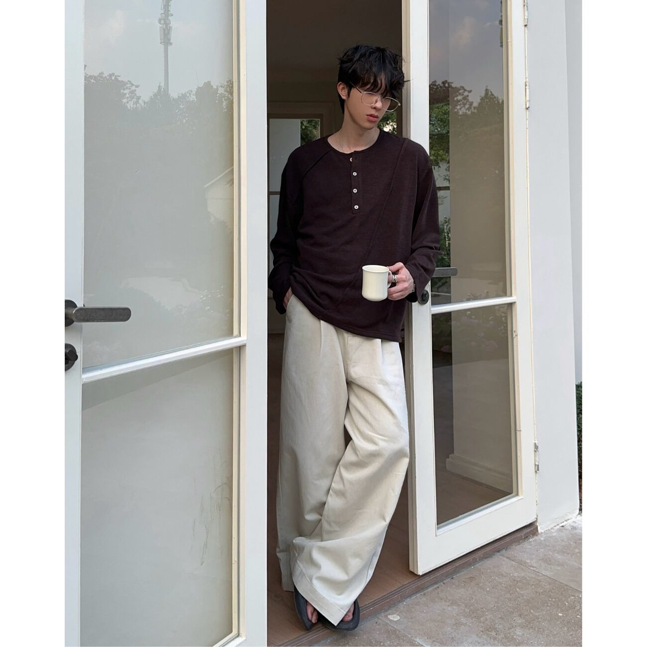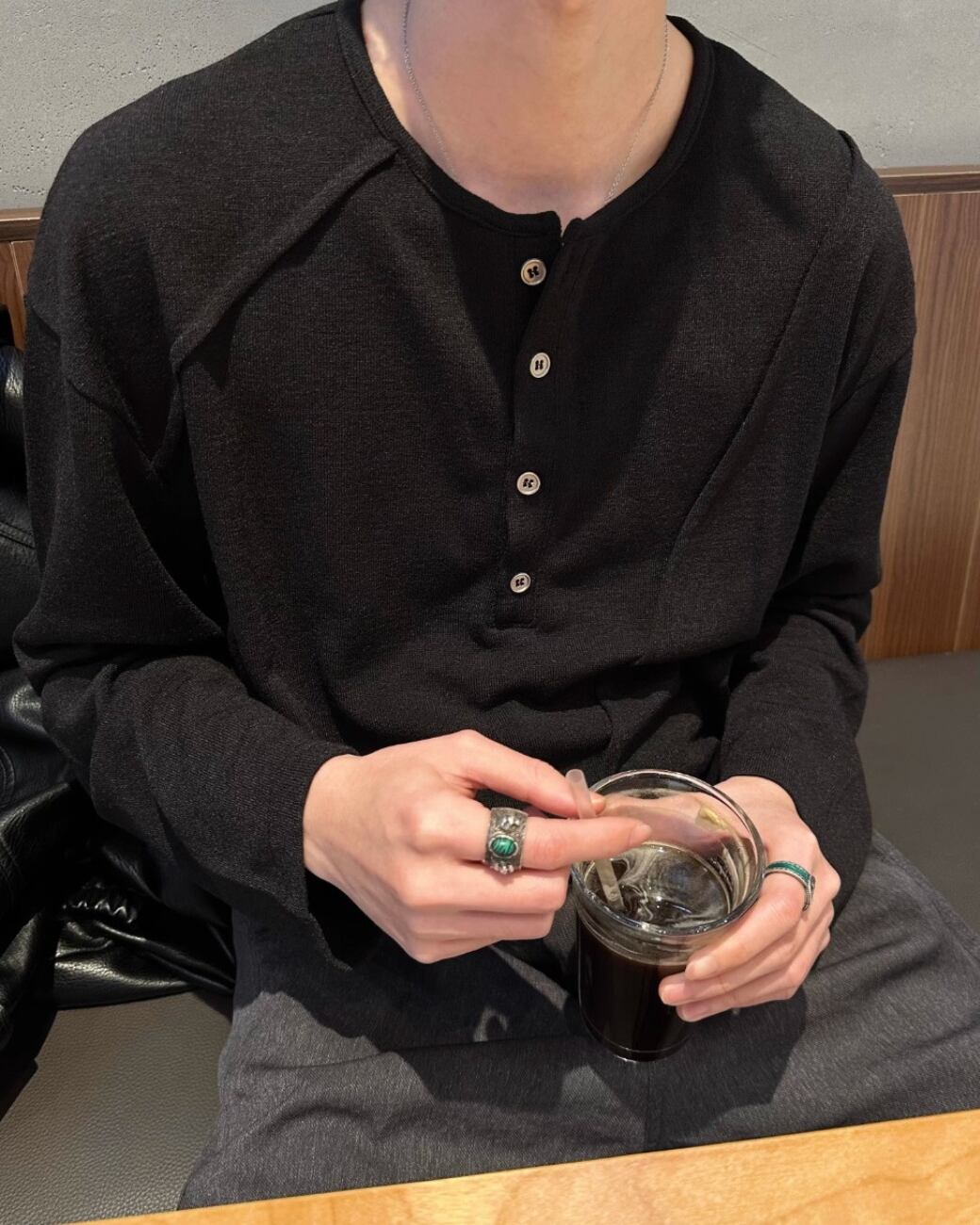 ヘンリーネックのボタンデザインが程よいアクセントになり、