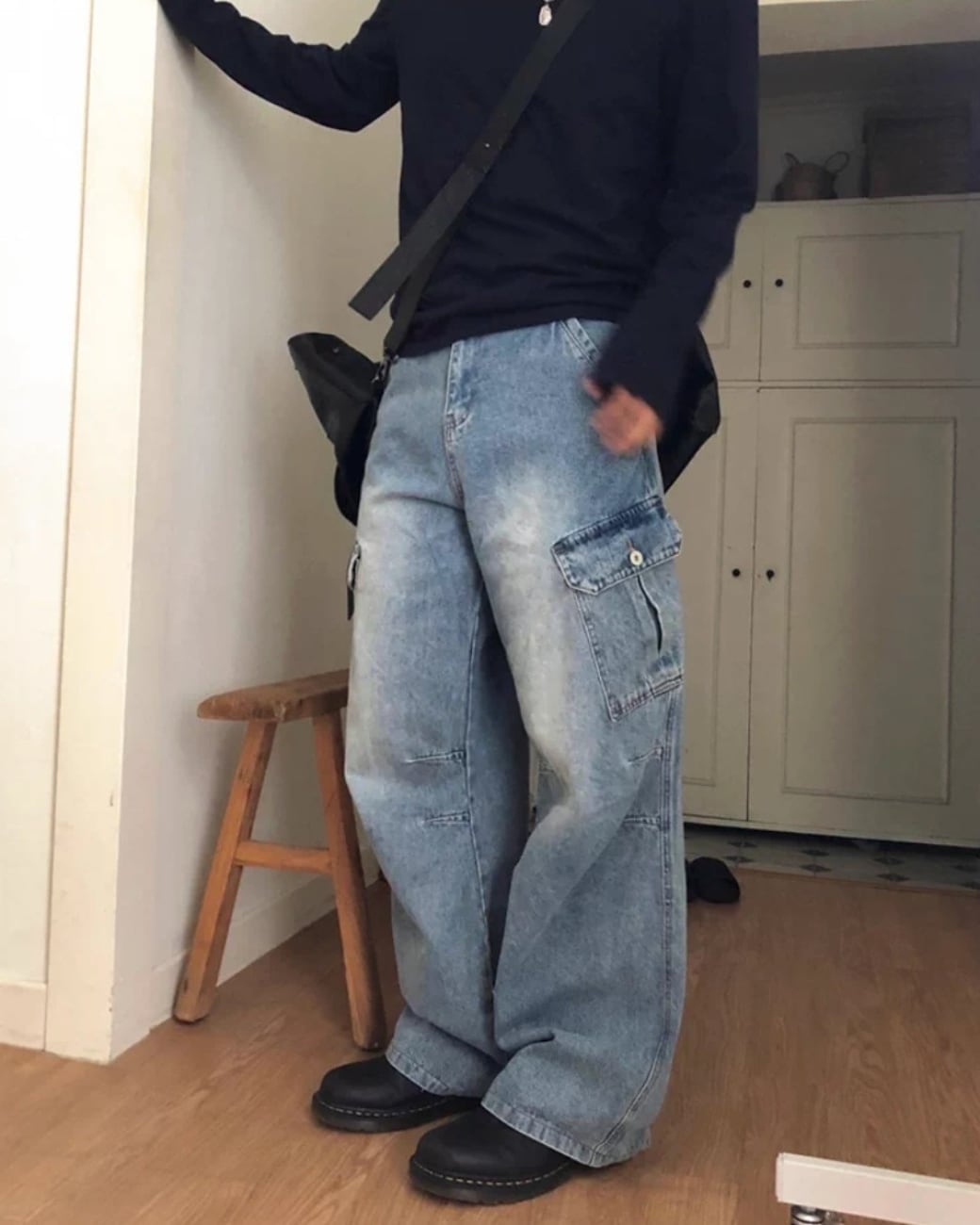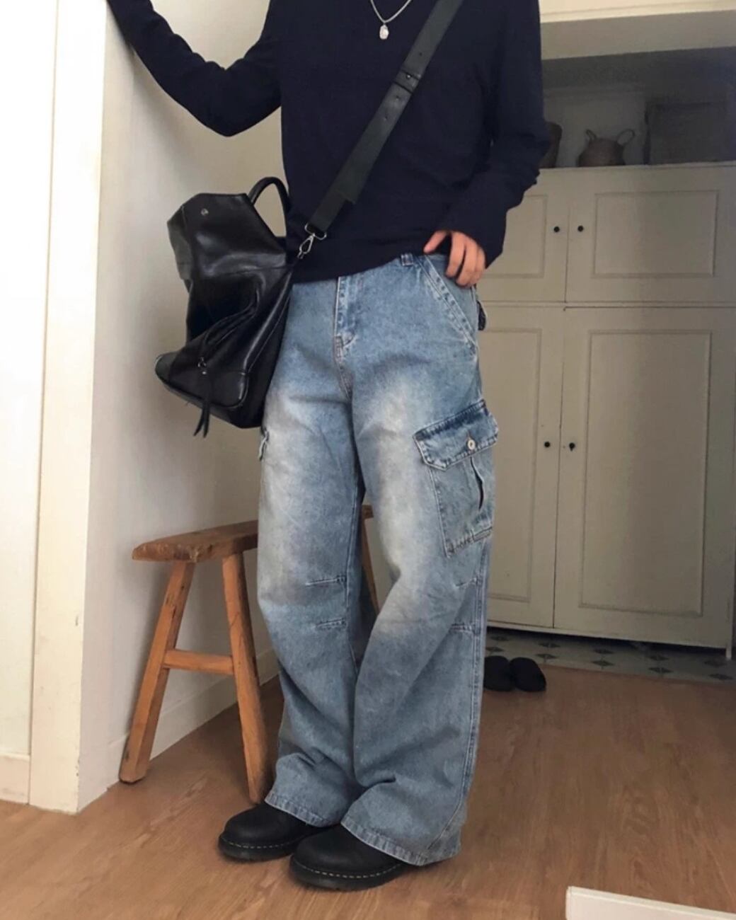 ヴィンテージ感のあるウォッシュデニムに、カーゴポケットを組み合わせたワイドデニムカーゴパンツ。
