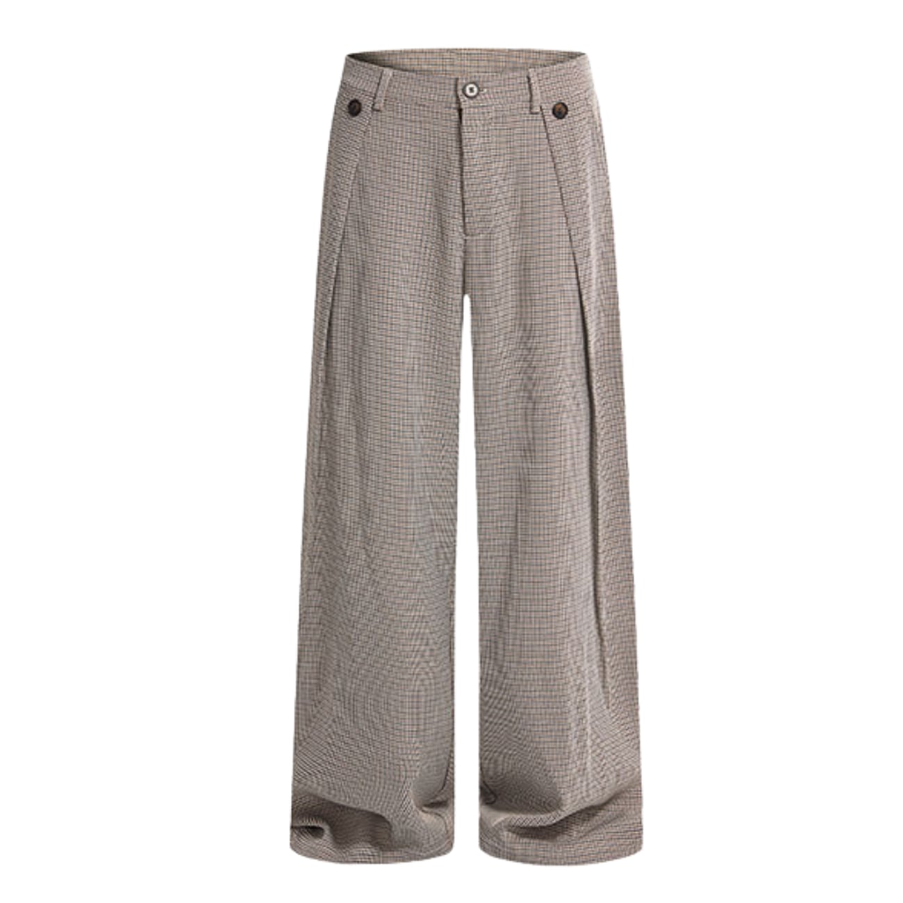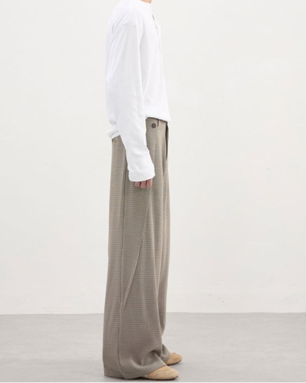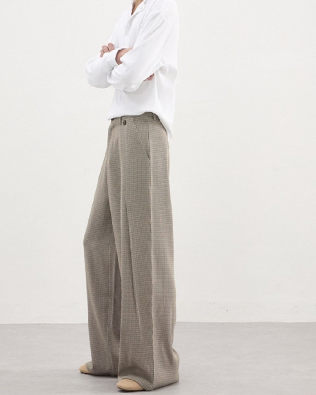 落ち着いたチェック柄が特徴のワイドパンツ。