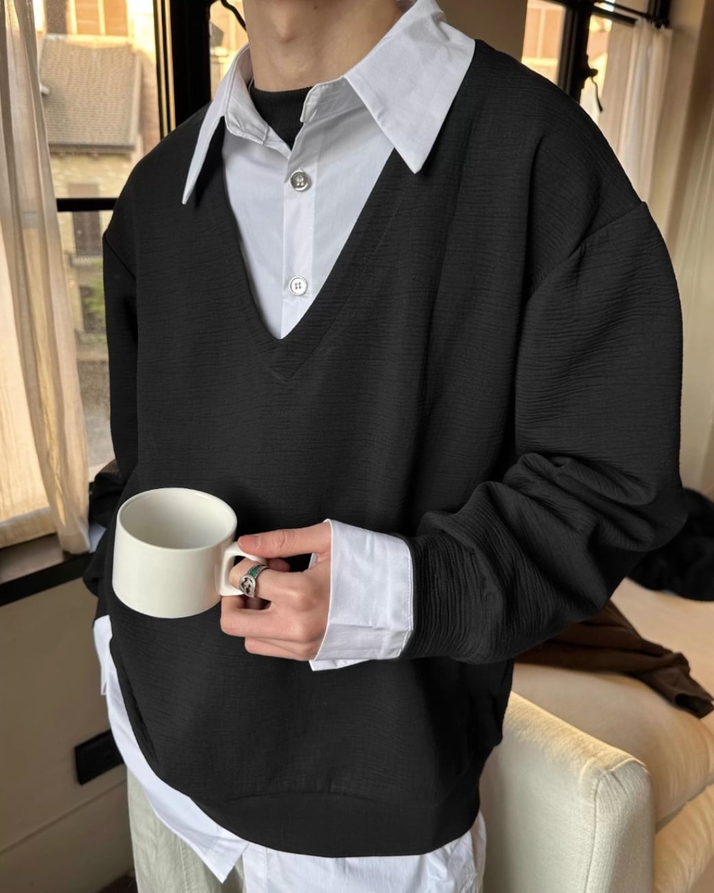 一枚で自然なレイヤードスタイルが完成し、シンプルながら雰囲気のあるコーディネートを演出してくれるアイテムです。