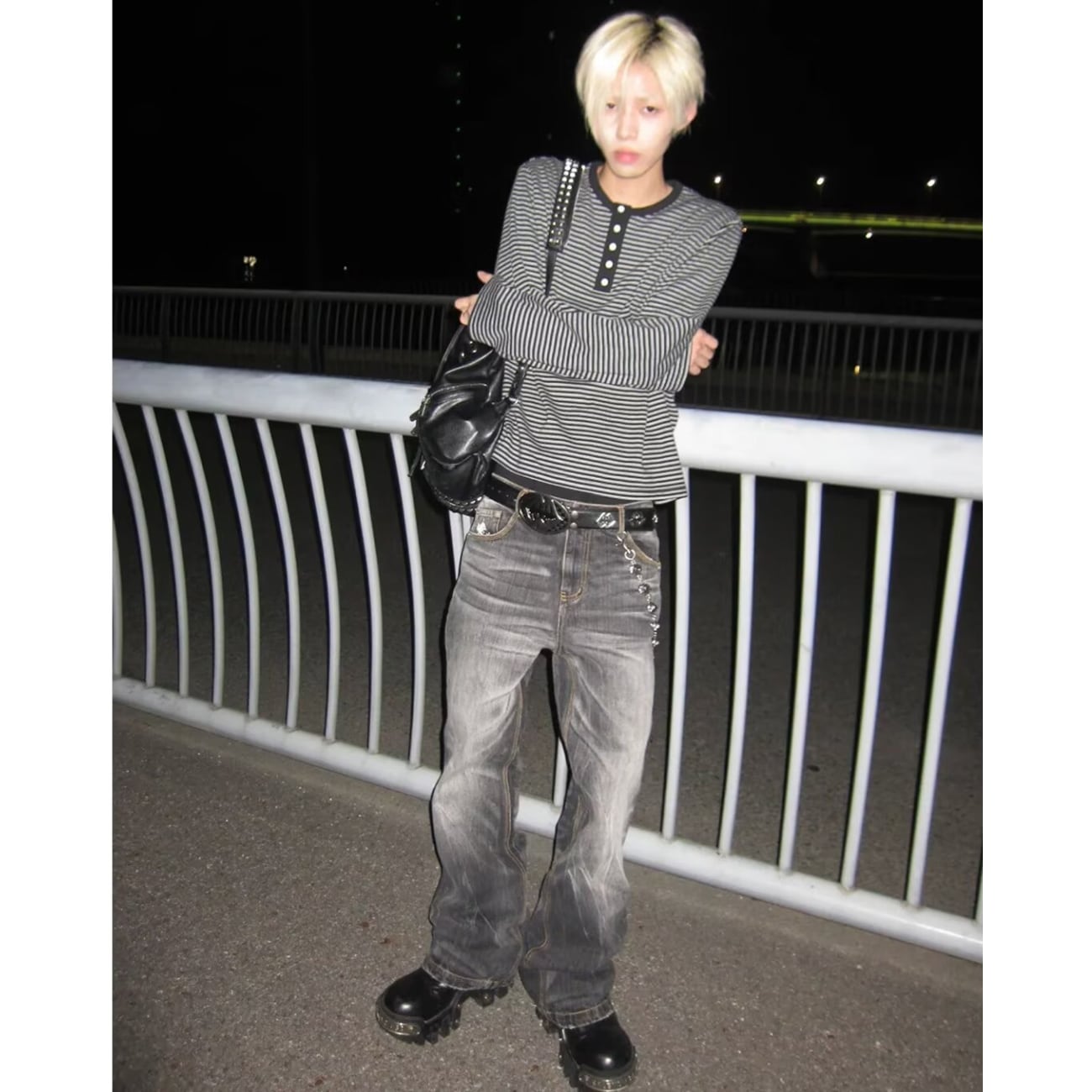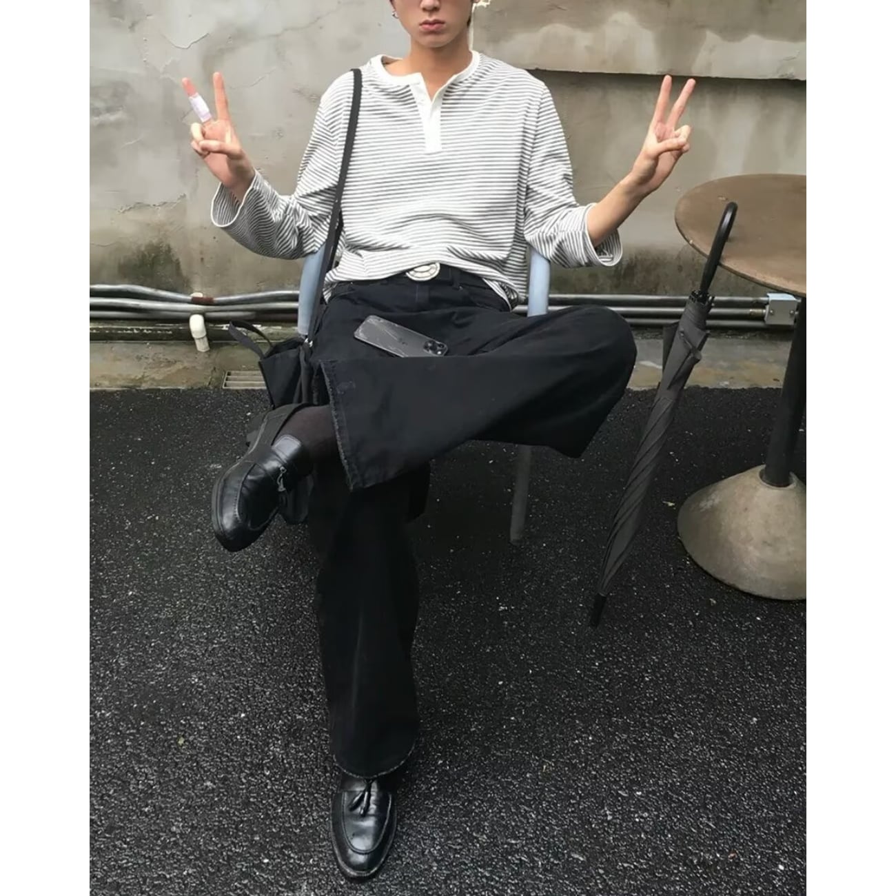 細めのボーダーとヘンリーネックを組み合わせた、着るだけで雰囲気が出るロンT。