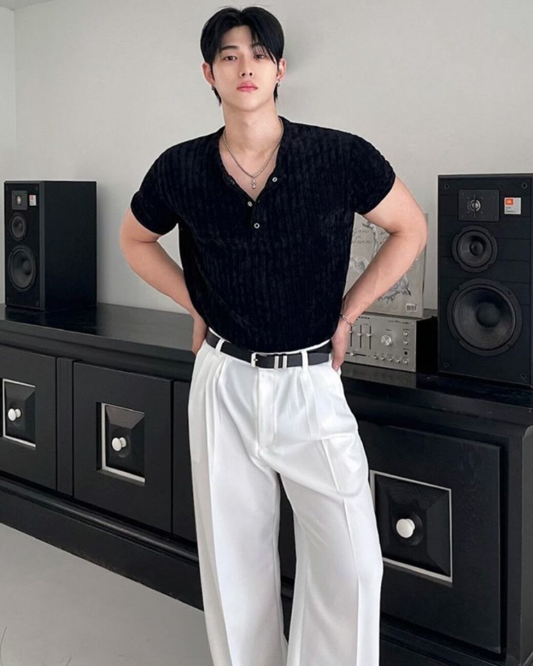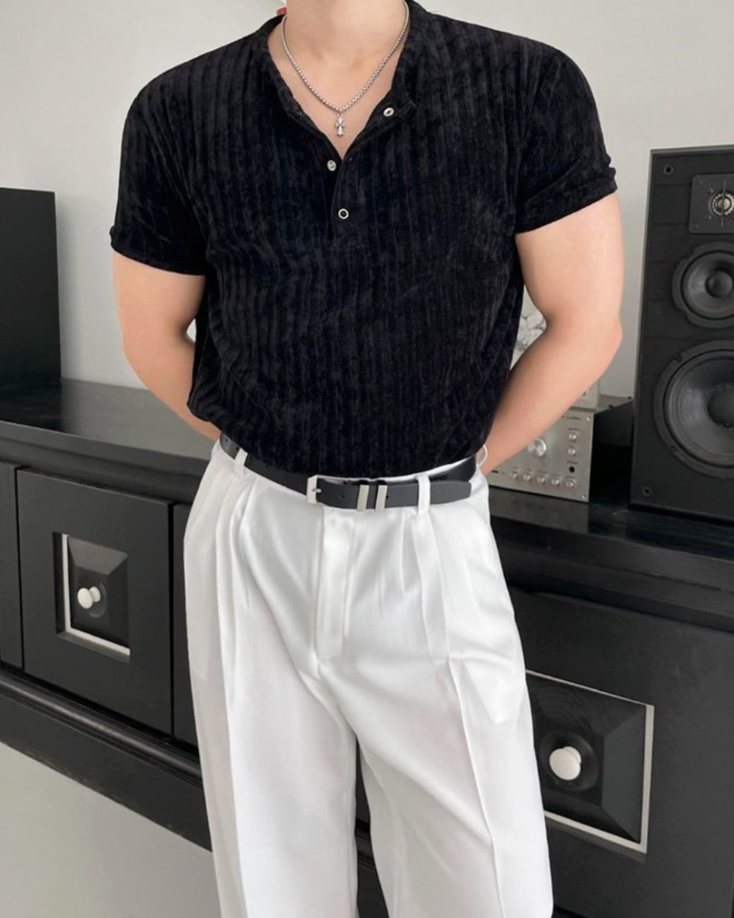 首元はヘンリーネック仕様で、ボタンの開け方によって印象を調整可能。
