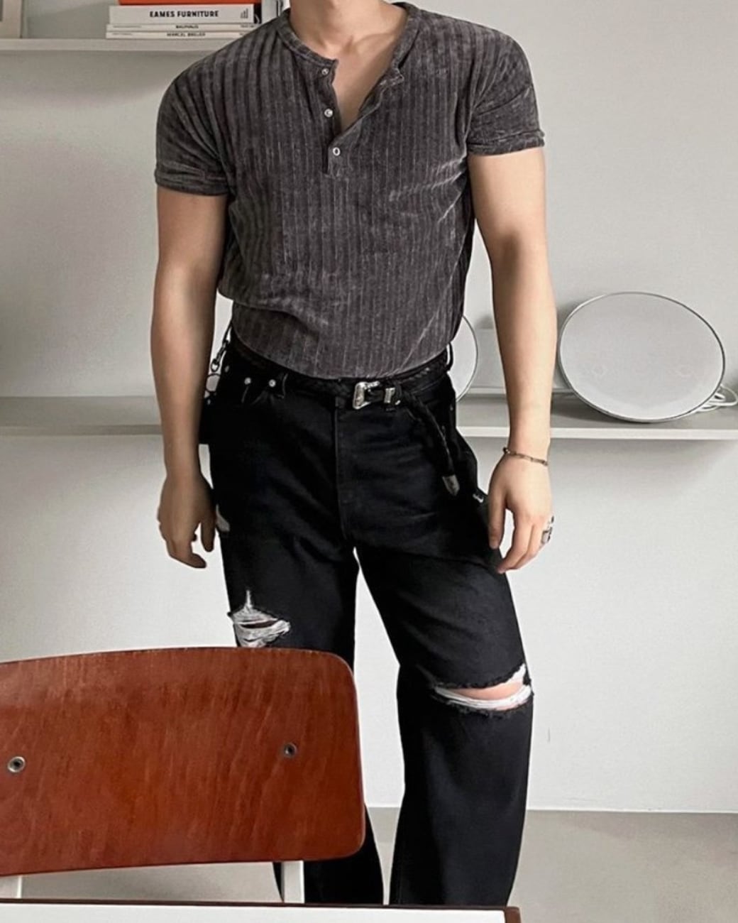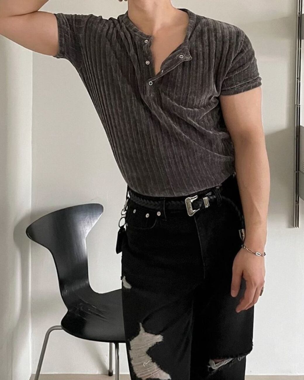 身体に自然に沿うリブ素材が、スタイルをきれいに引き立てるヘンリーネックT。