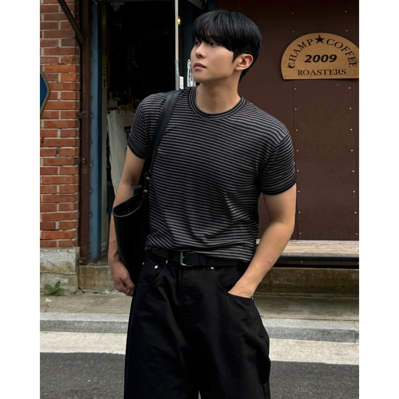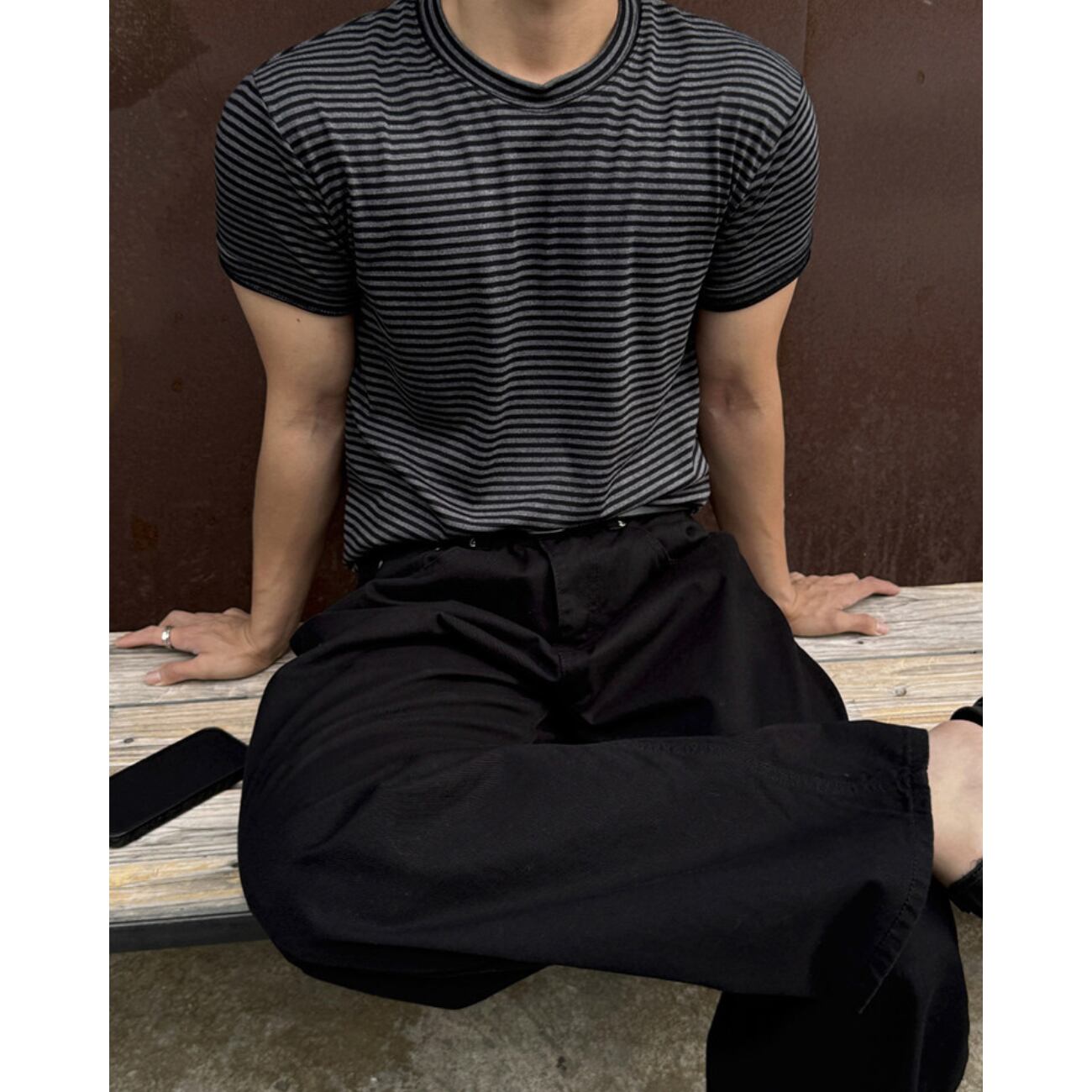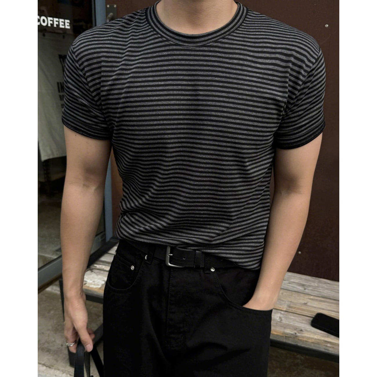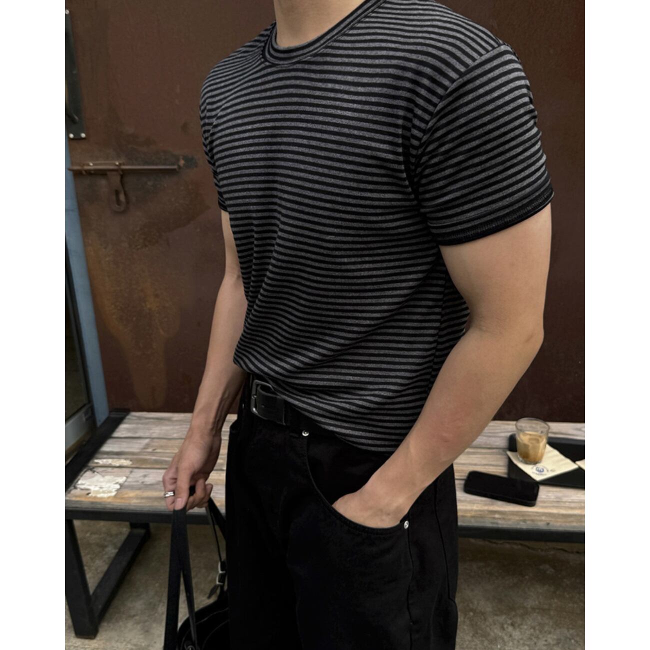 ブラック×グレーのダークトーンでまとめた、上品な印象のボーダーTシャツ。