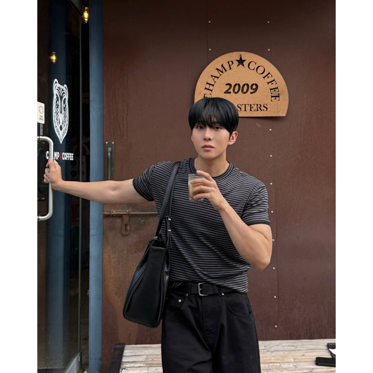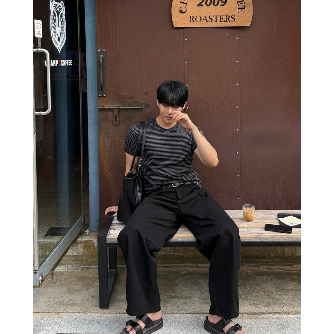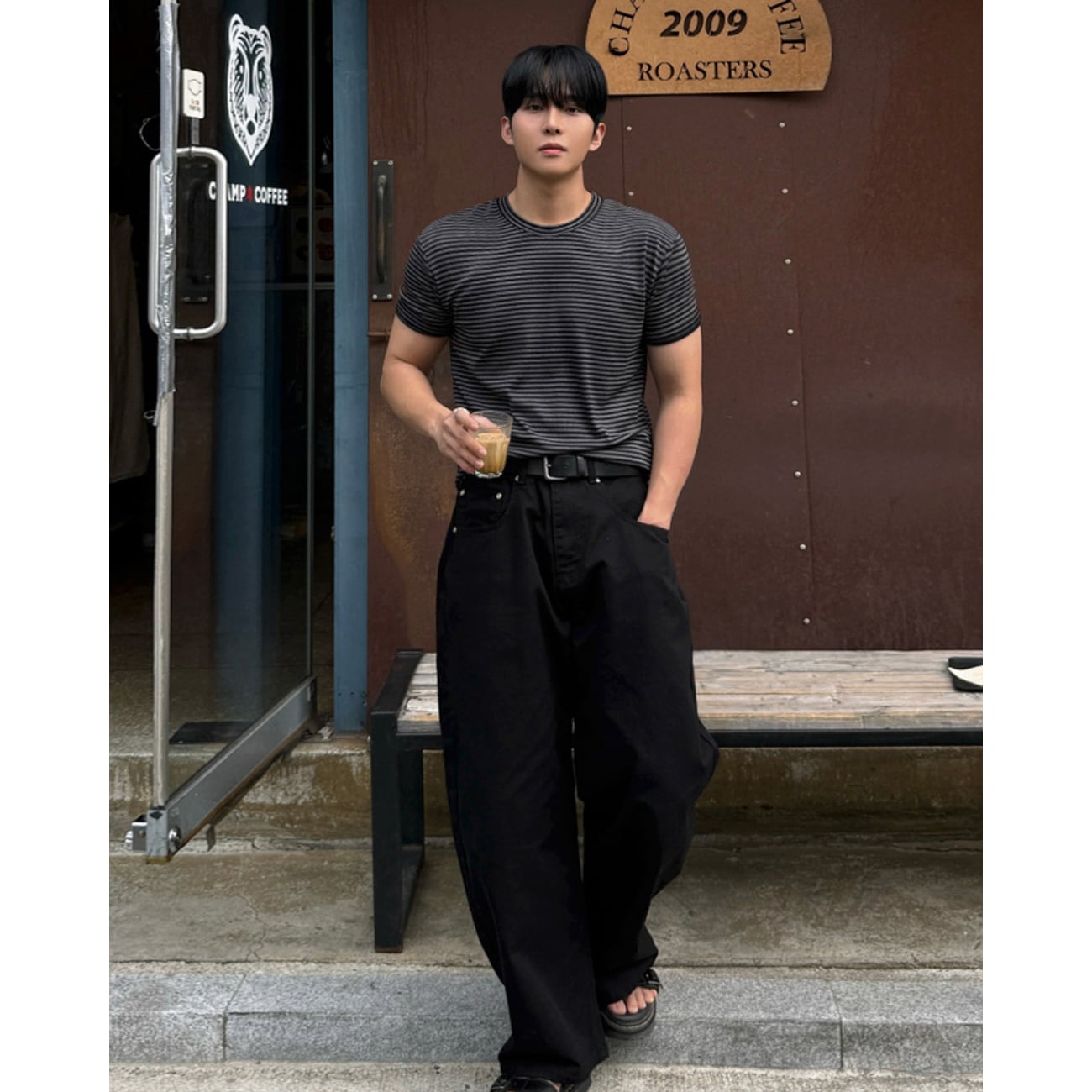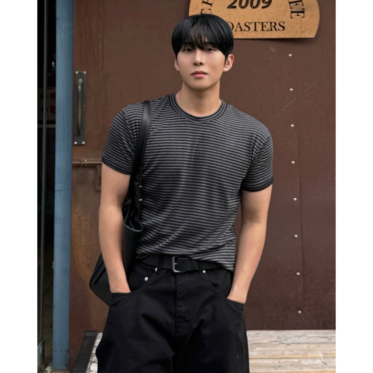 ブラック×グレーのダークトーンでまとめた、上品な印象のボーダーTシャツ。