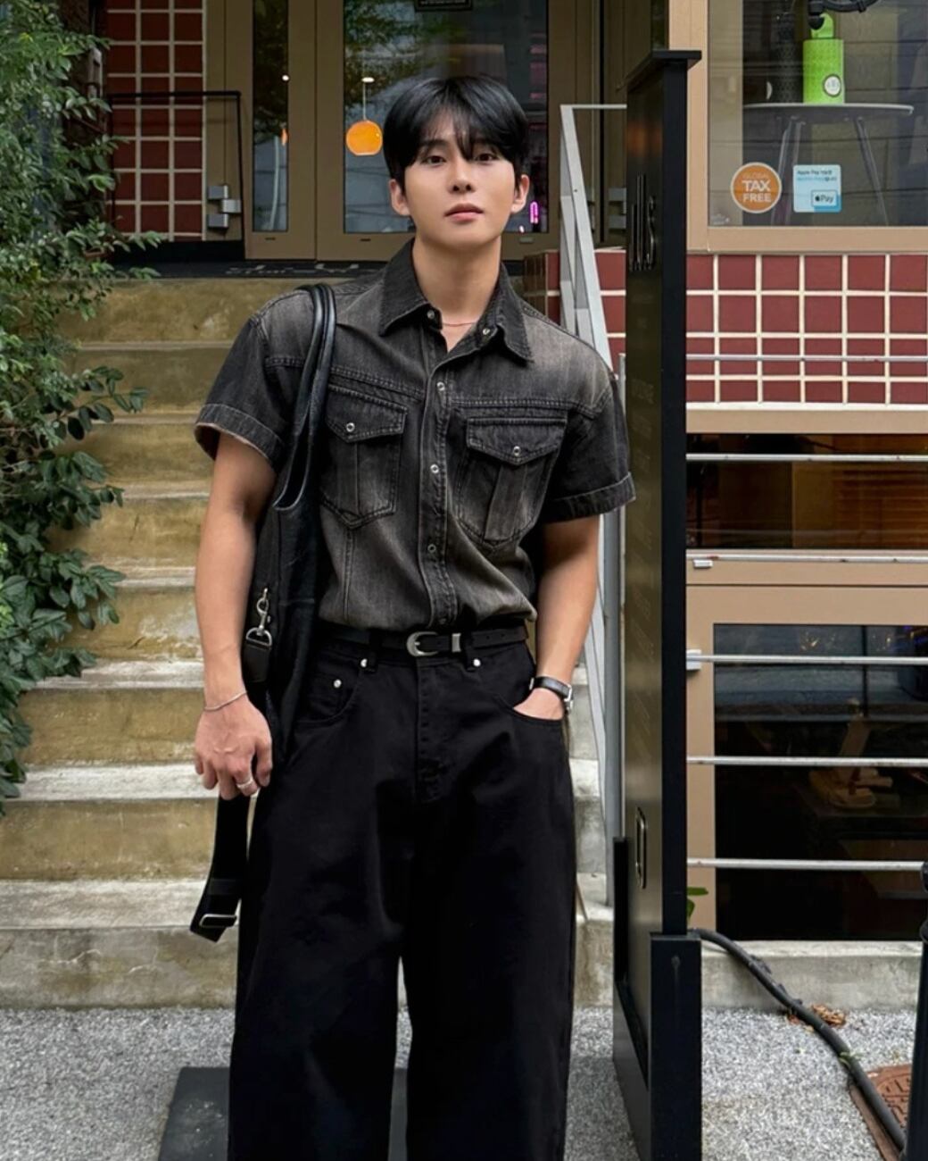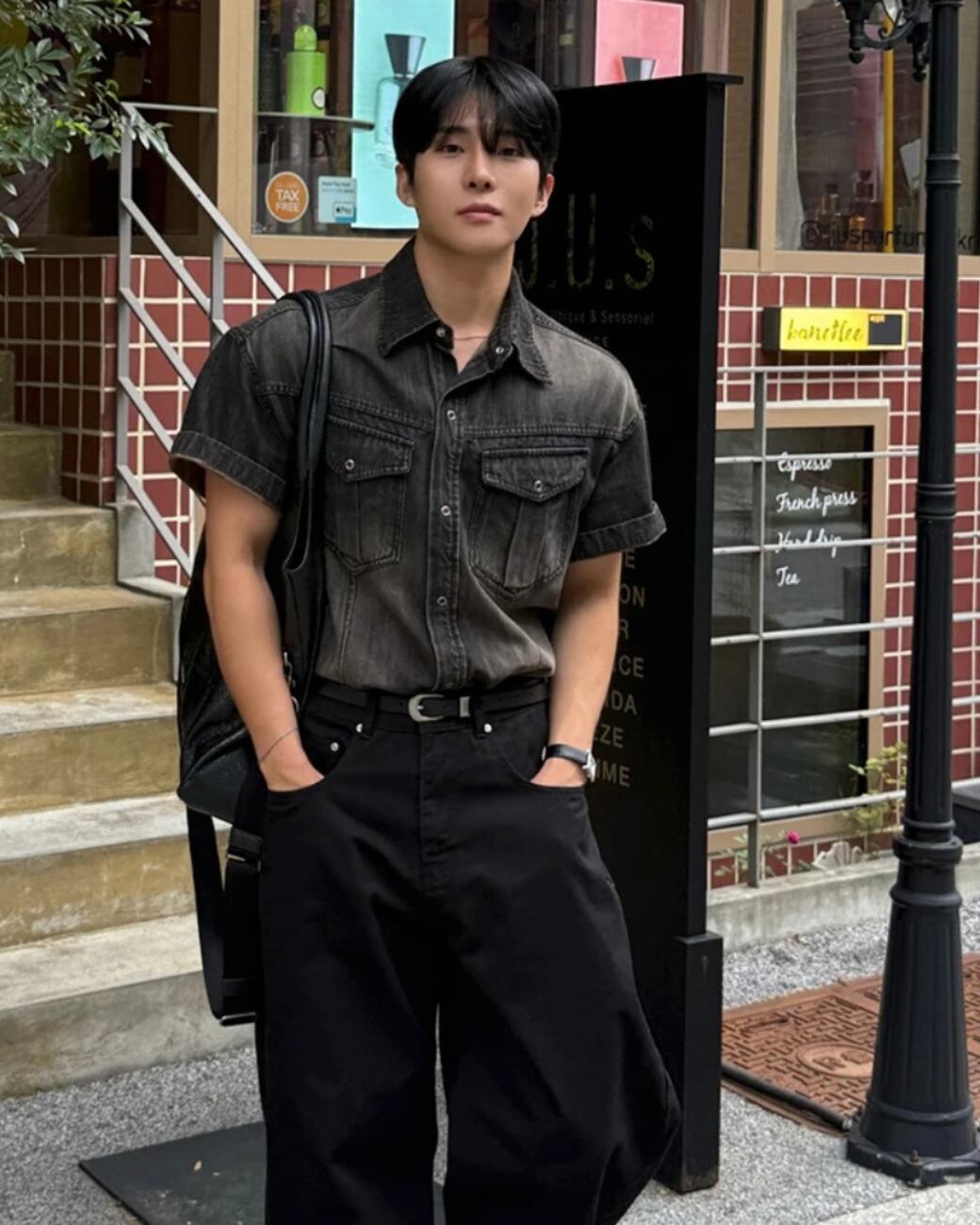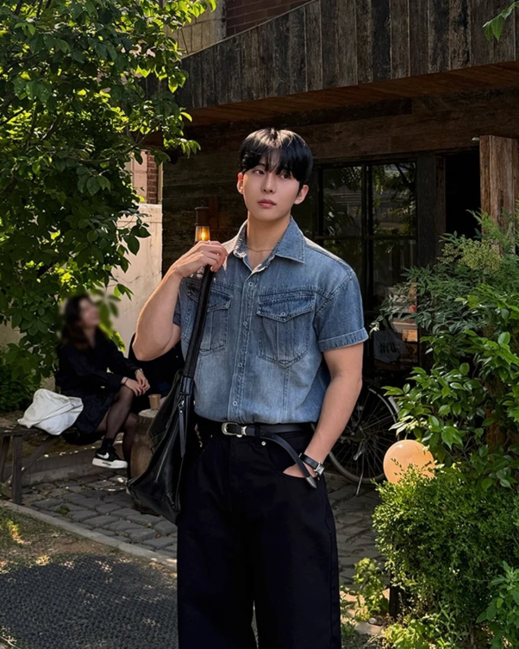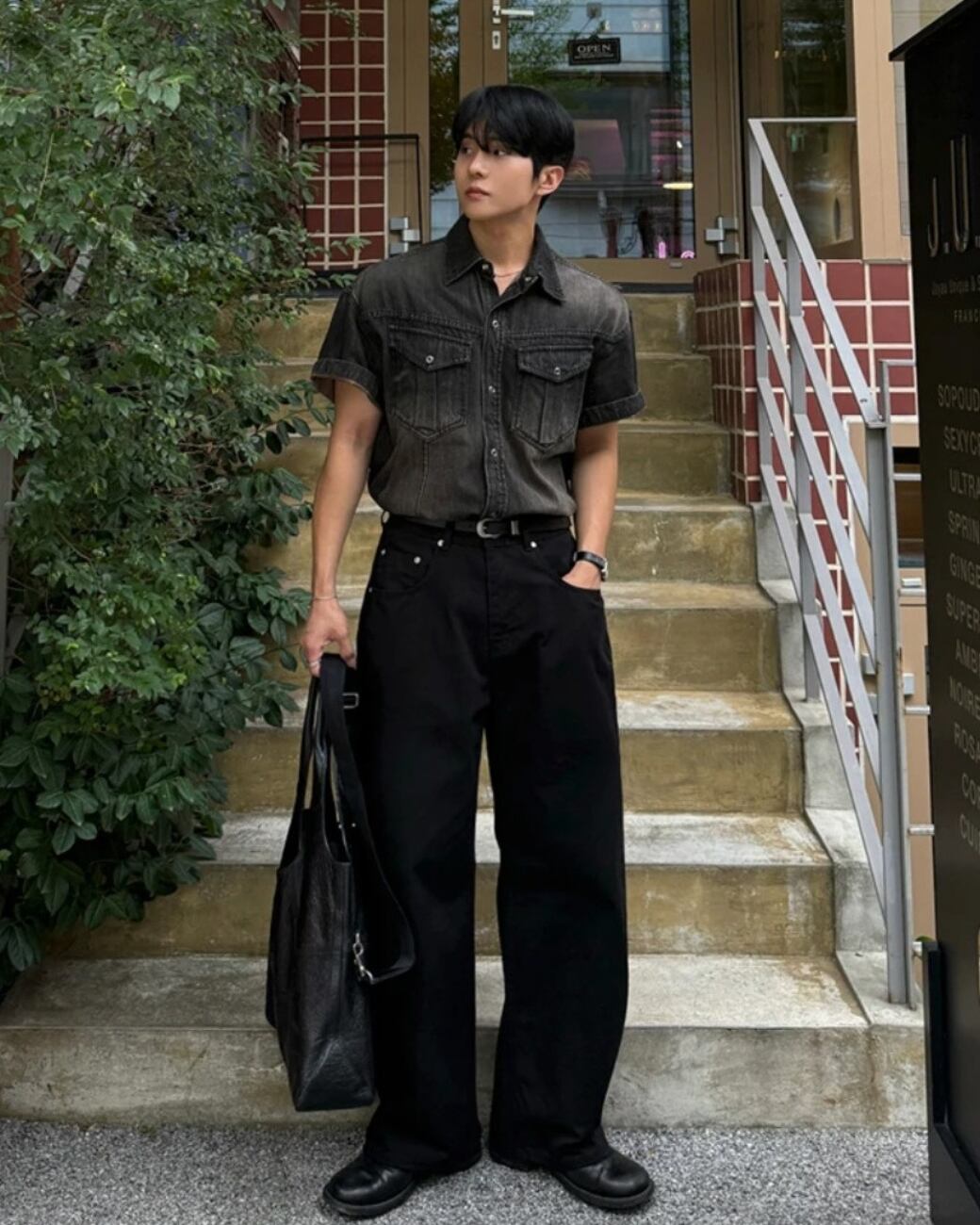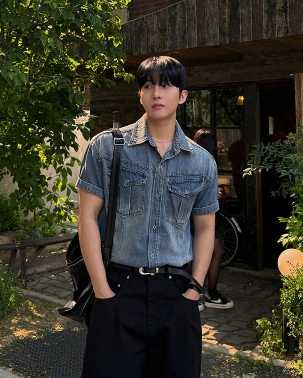 程よくフェード感のあるデニム生地が、カジュアルすぎず落ち着いた印象に。
