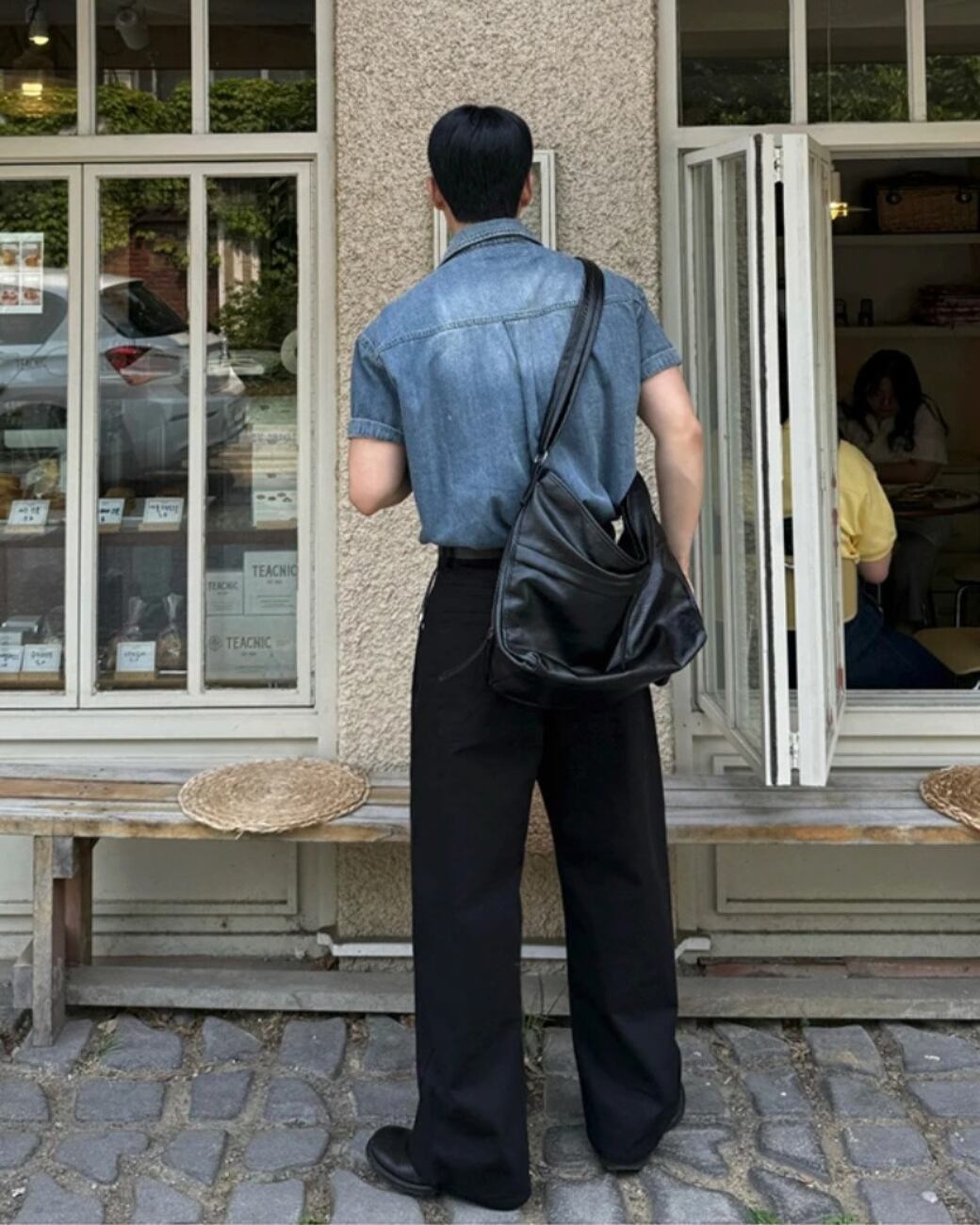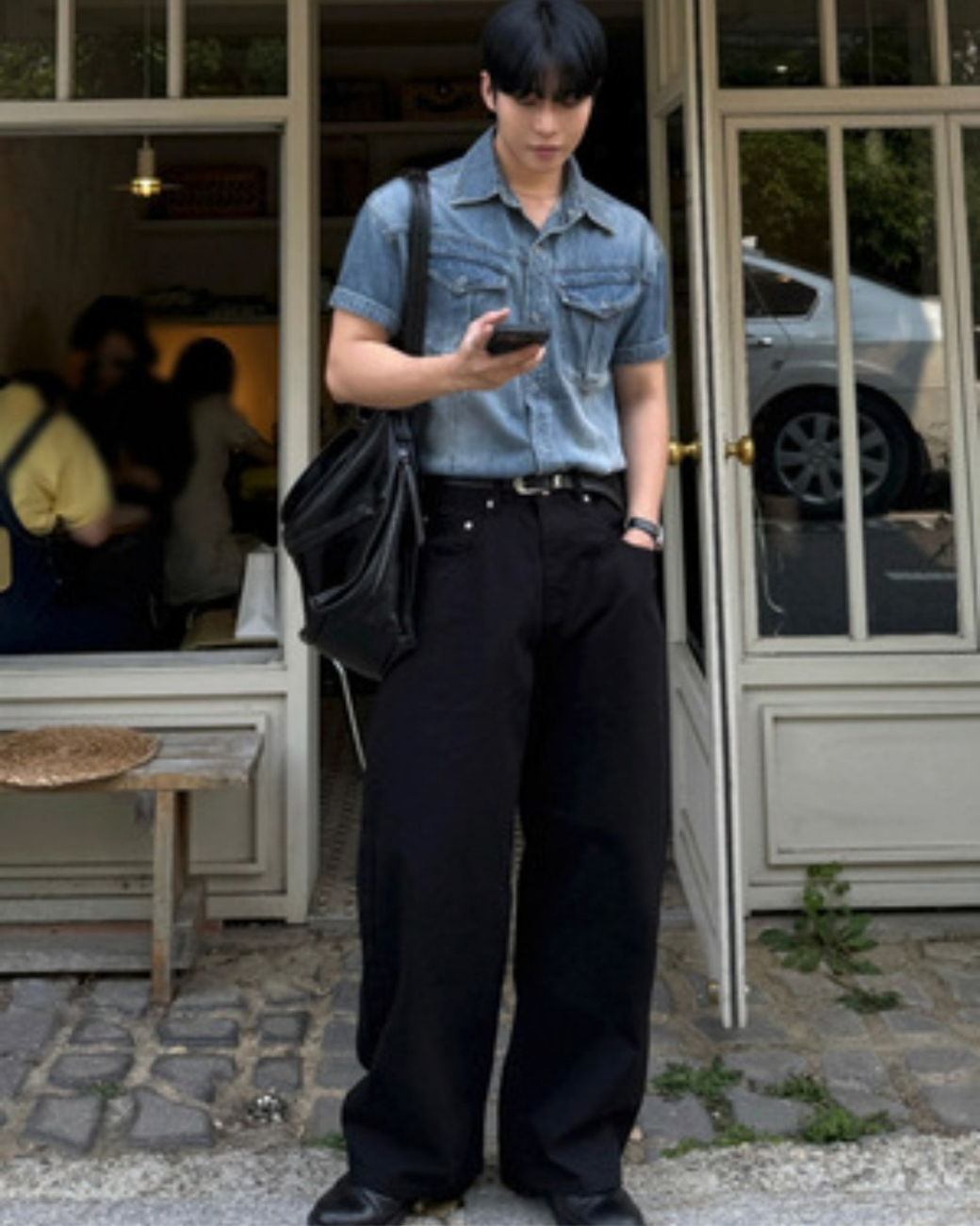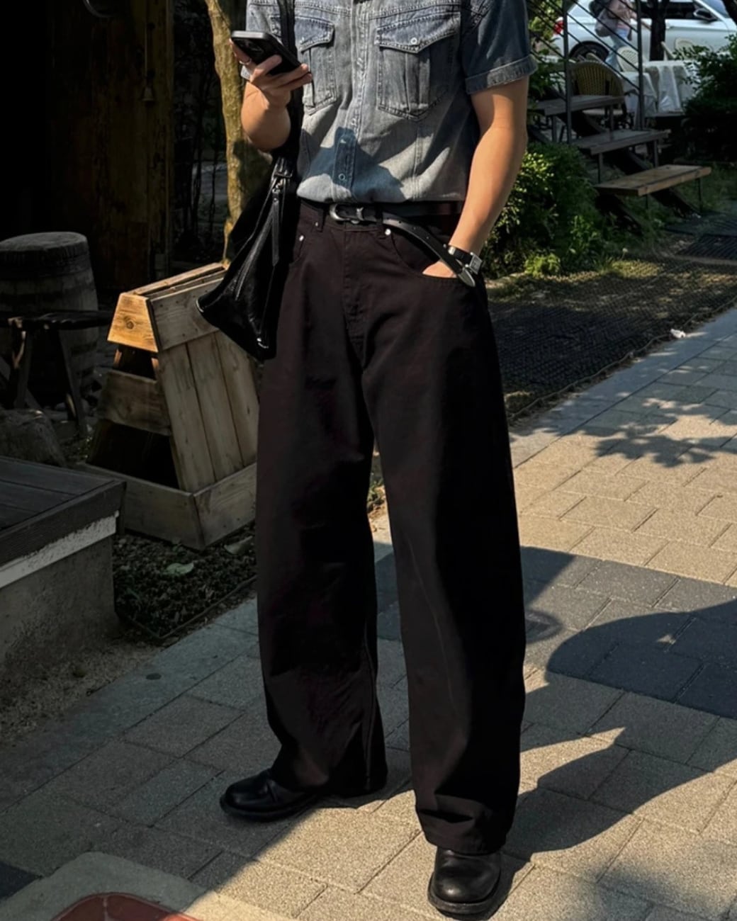 主張しすぎないストレートシルエットが、全体のバランスを整えつつ、落ち着いた大人っぽさを演出します。
