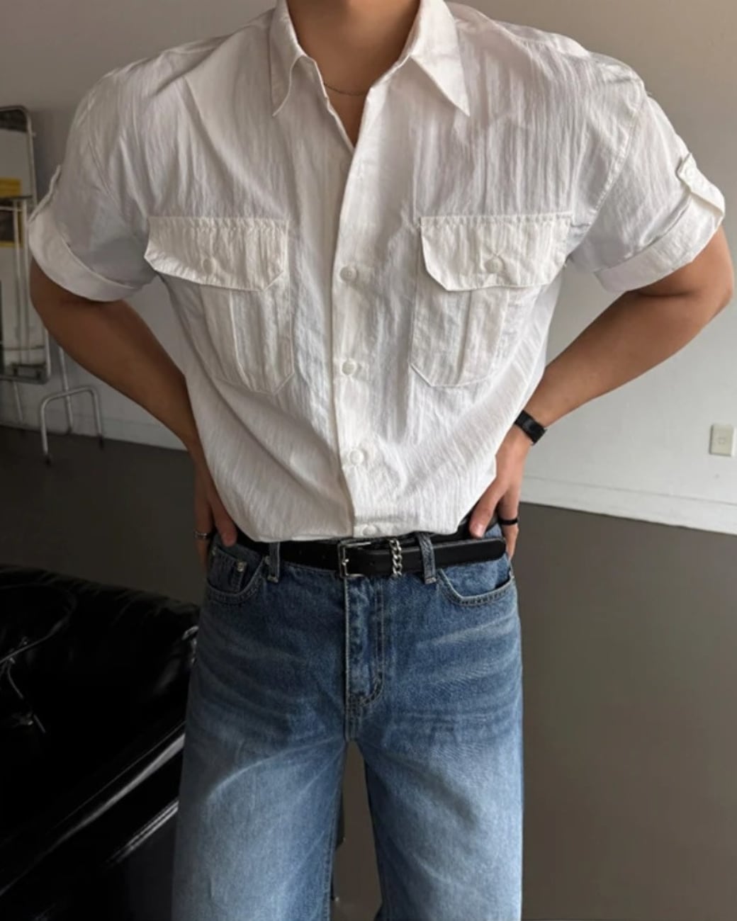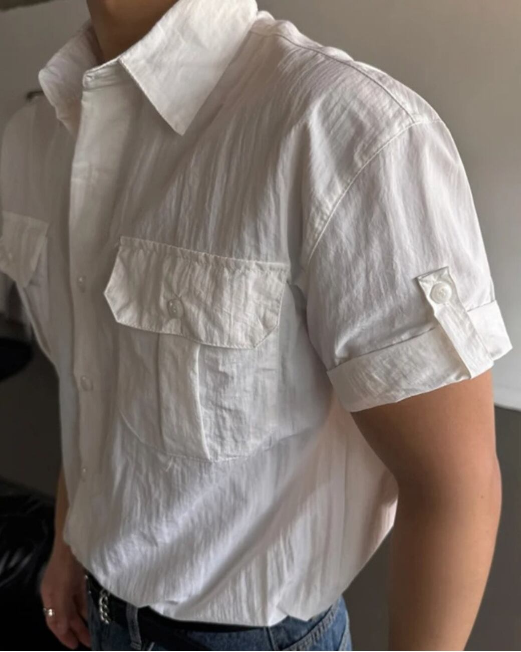 フロントのフラップポケットがアクセントになった半袖シャツ。